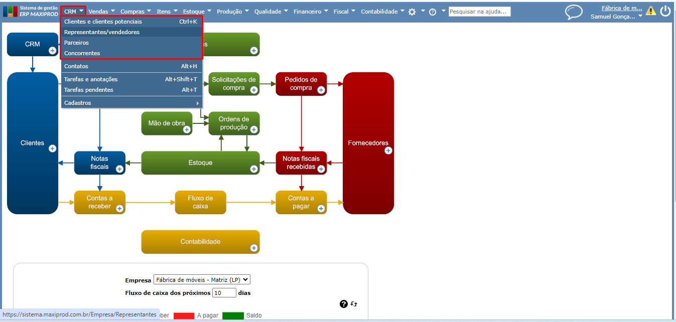 1) Acesse o menu superior “CRM” e escolha a opção que corresponde ao tipo de empresa que se deseja cadastrar (cliente, fornecedores, parceiros, etc.).