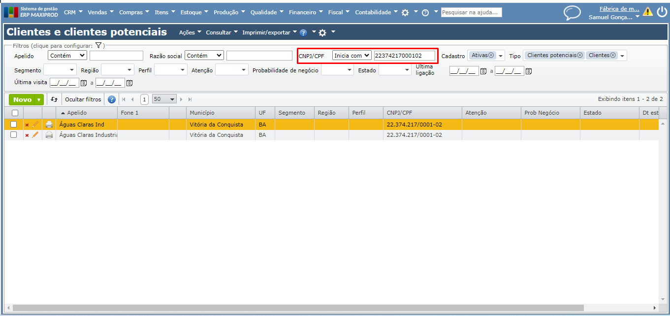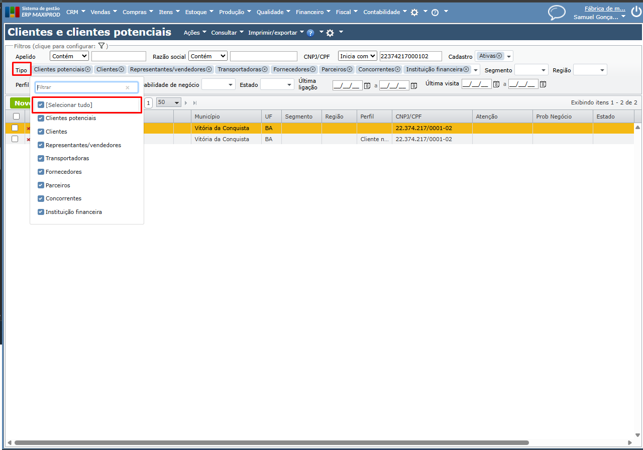 a) Talvez seja importante marcar todas as opções do filtro “Tipo” (existem casos em que aquele CNPJ ou CPF se encontra cadastrado com um tipo de empresa diferente da que o usuário está tentando cadastrar, por exemplo, o usuário está tentando cadastrar o CNPJ/CPF como cliente, mas o cadastro já existe como fornecedor).