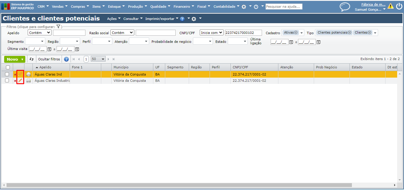 a) Na grade de empresas, localize o cadastro criado em duplicidade.