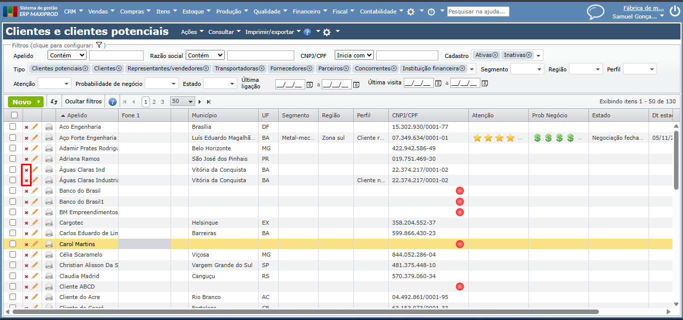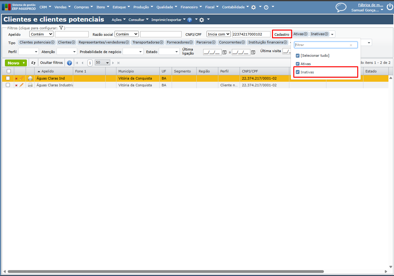 b) Pode ser necessário filtrar também por cadastros “Inativos” (existem casos em que o CNPJ/CPF foi cadastrado em algum momento, mas se encontra inativo).