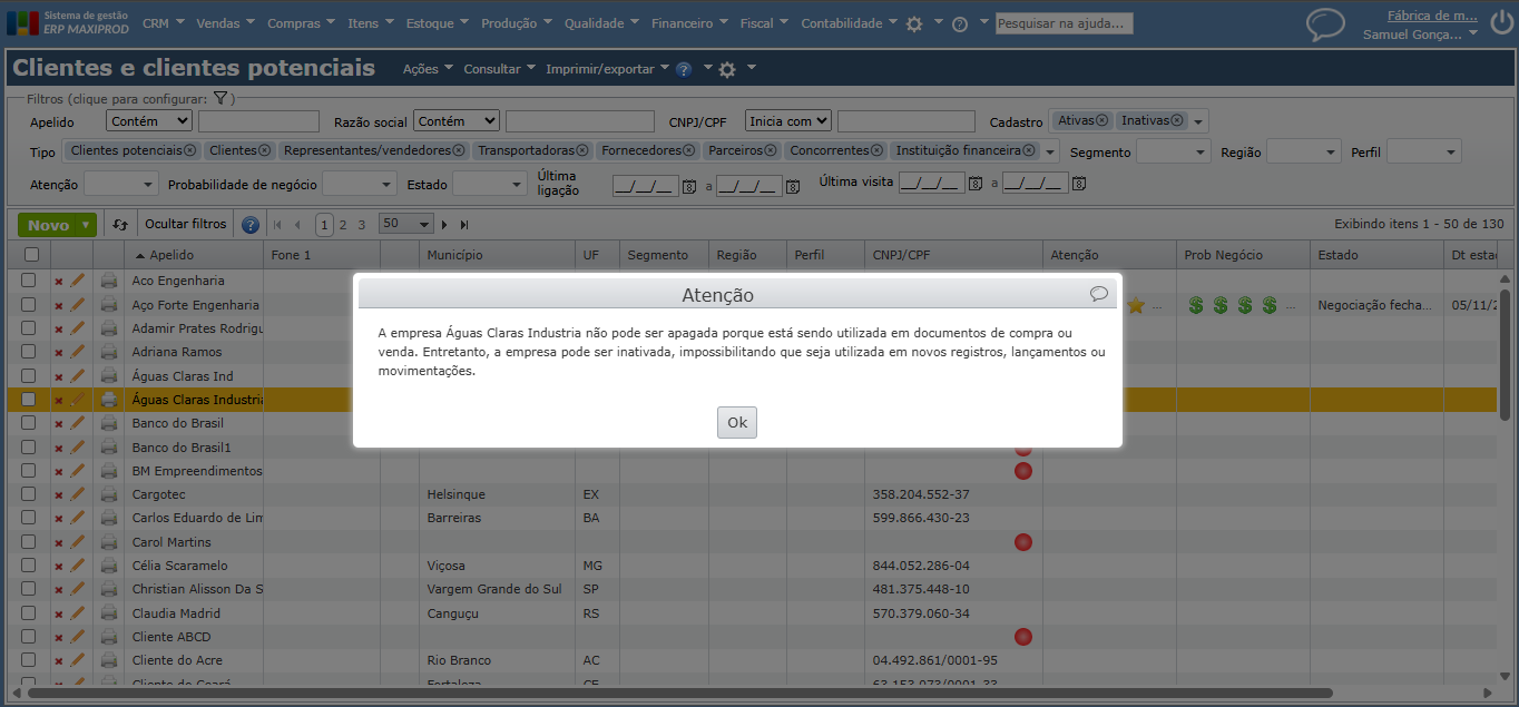 Ao identificar que determinada empresa foi cadastrada em duplicidade de maneira equivocada, o usuário pode excluir o cadastro desnecessário. Mas existem casos em que isso não é possível, por ambos os cadastros possuírem vínculos com outros registros no sistema, como pedidos, notas fiscais, contas a receber e a pagar, etc.