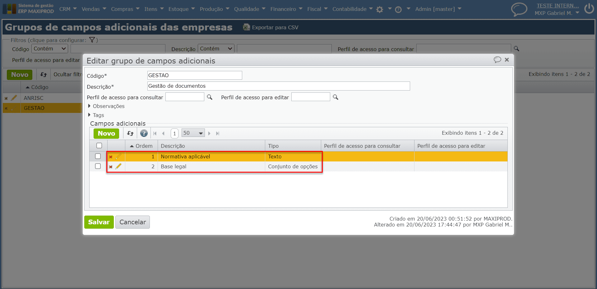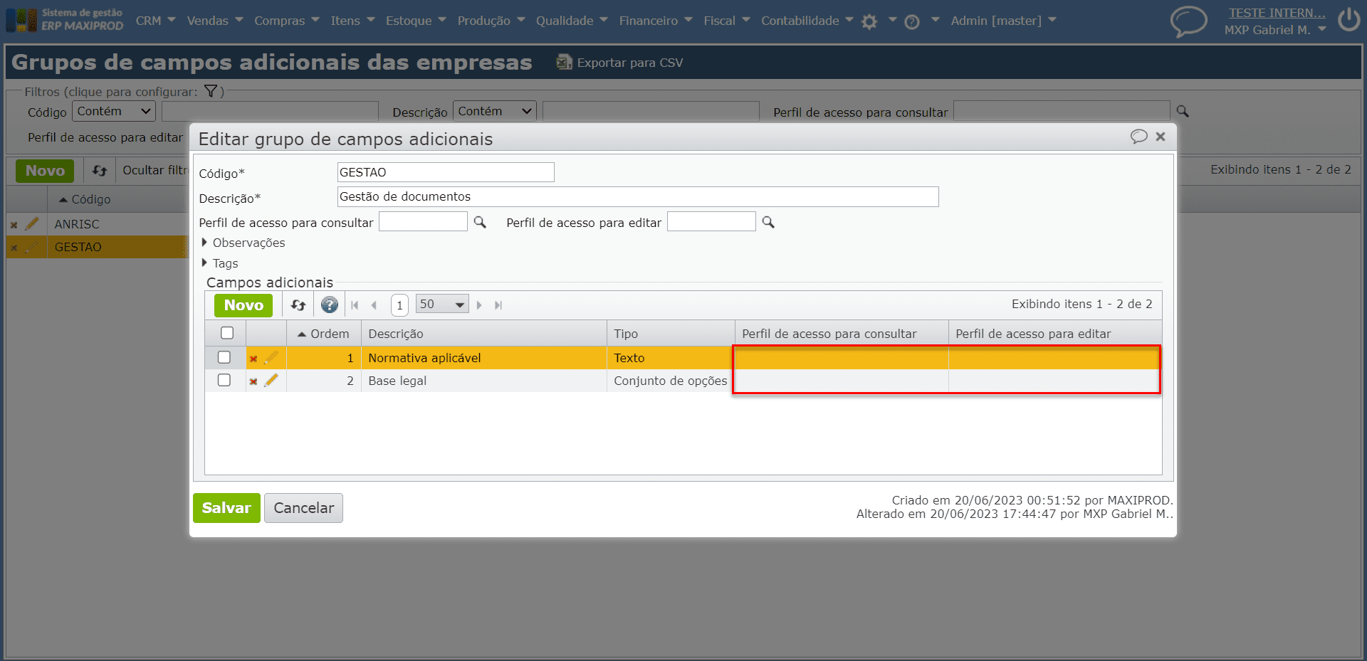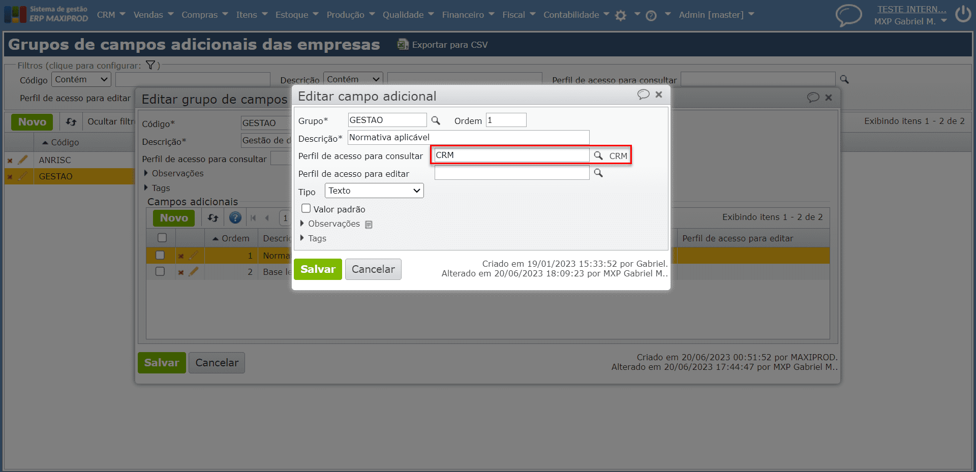 - Perfil de acesso para consultar: inicializa o campo de mesmo nome, nos campos adicionais inseridos no grupo, caso se deseje limitar sua visualização.