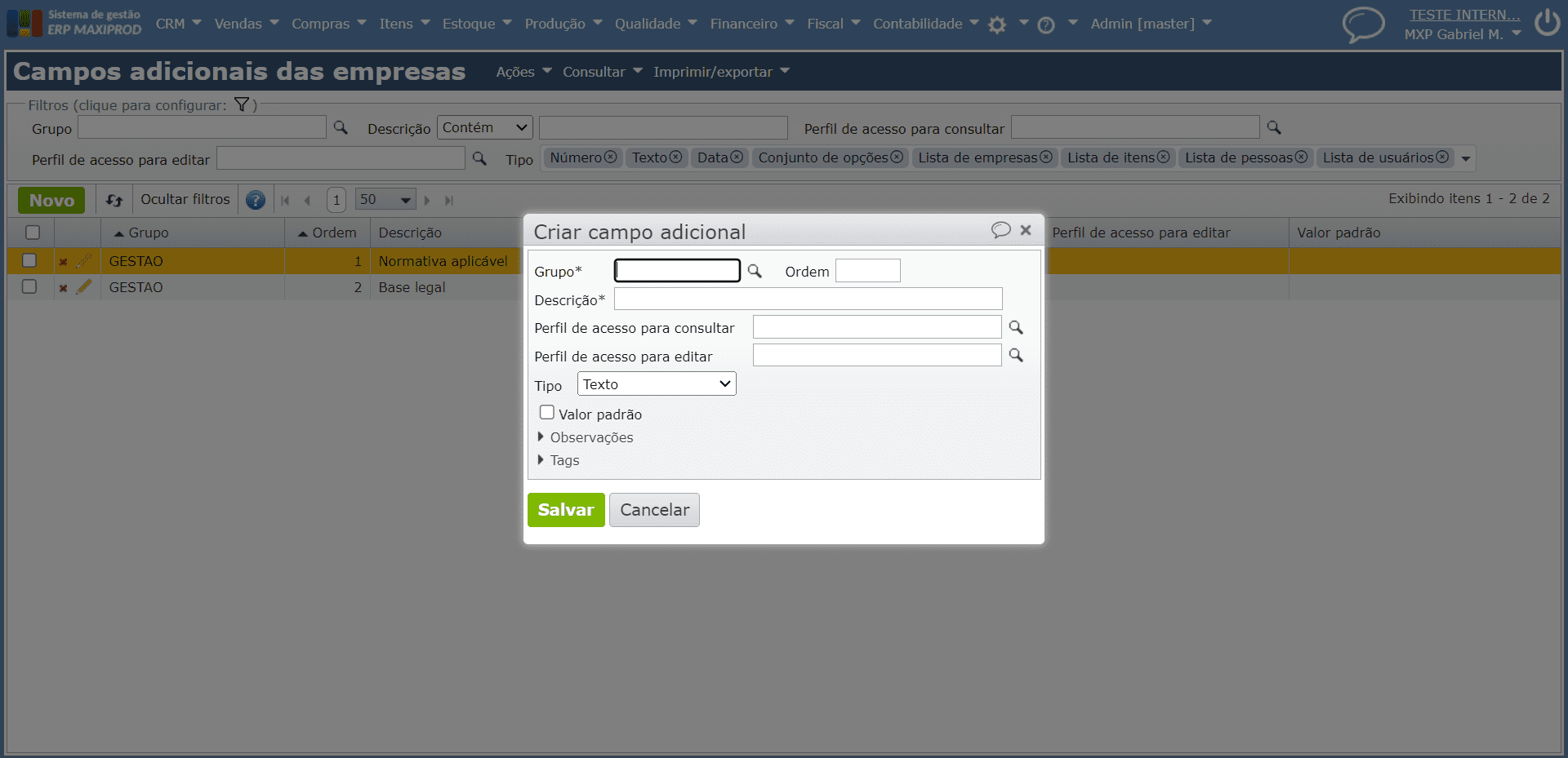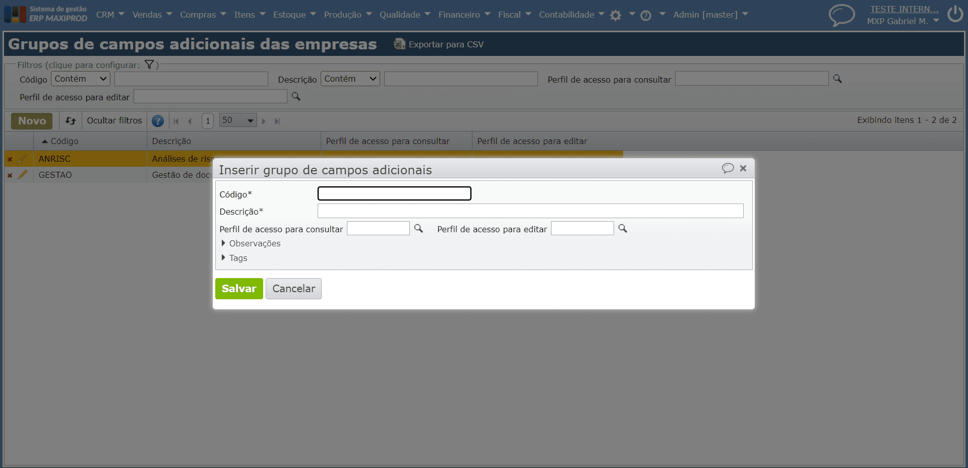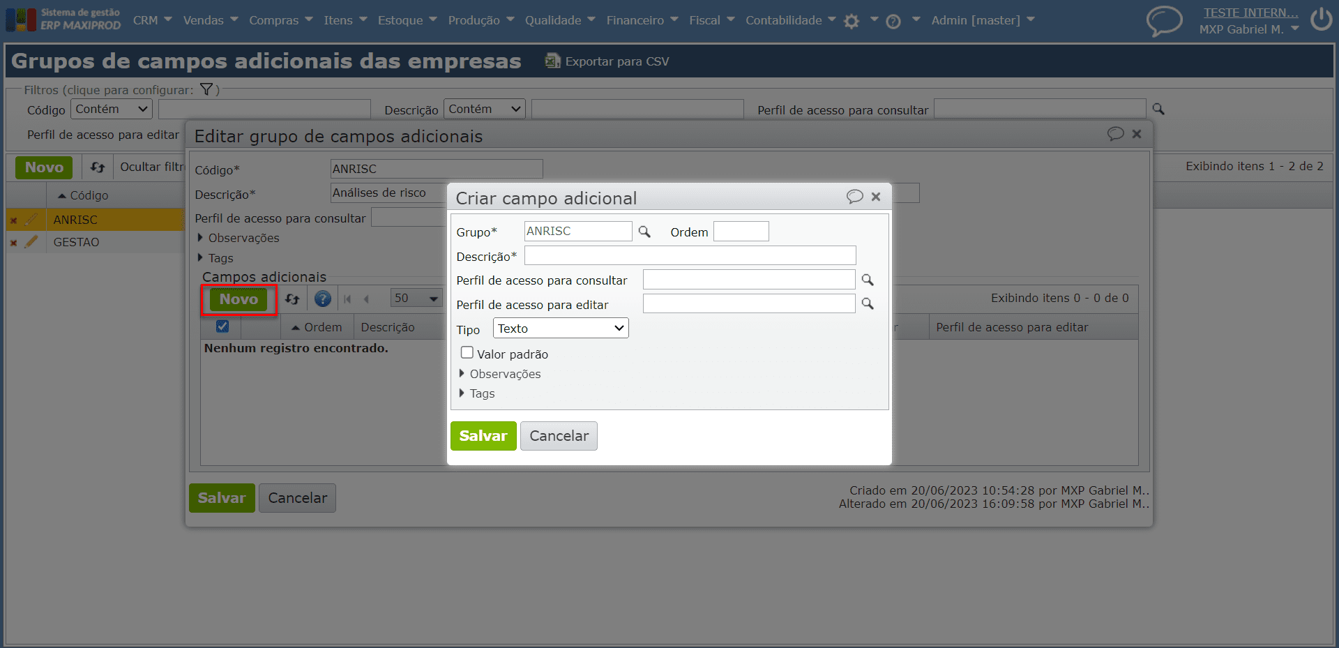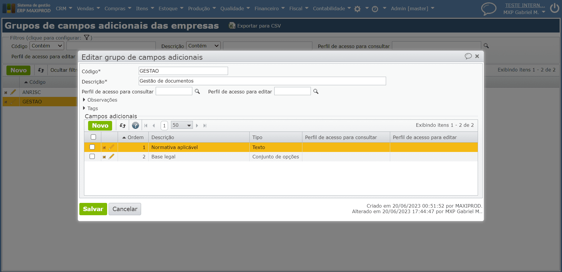 - Perfil de acesso para consultar: inicializa o campo de mesmo nome, nos campos adicionais inseridos no grupo, caso se deseje limitar sua visualização.