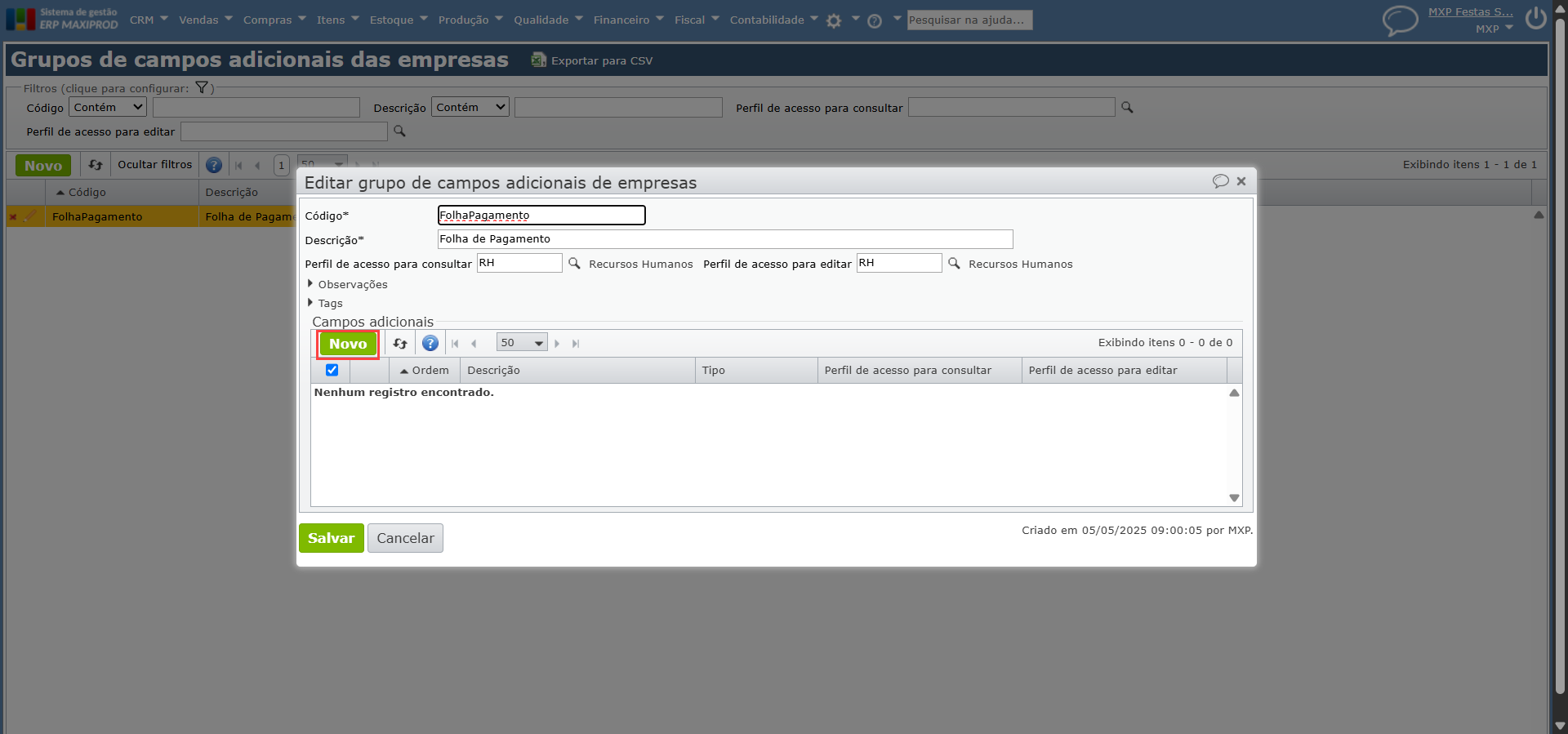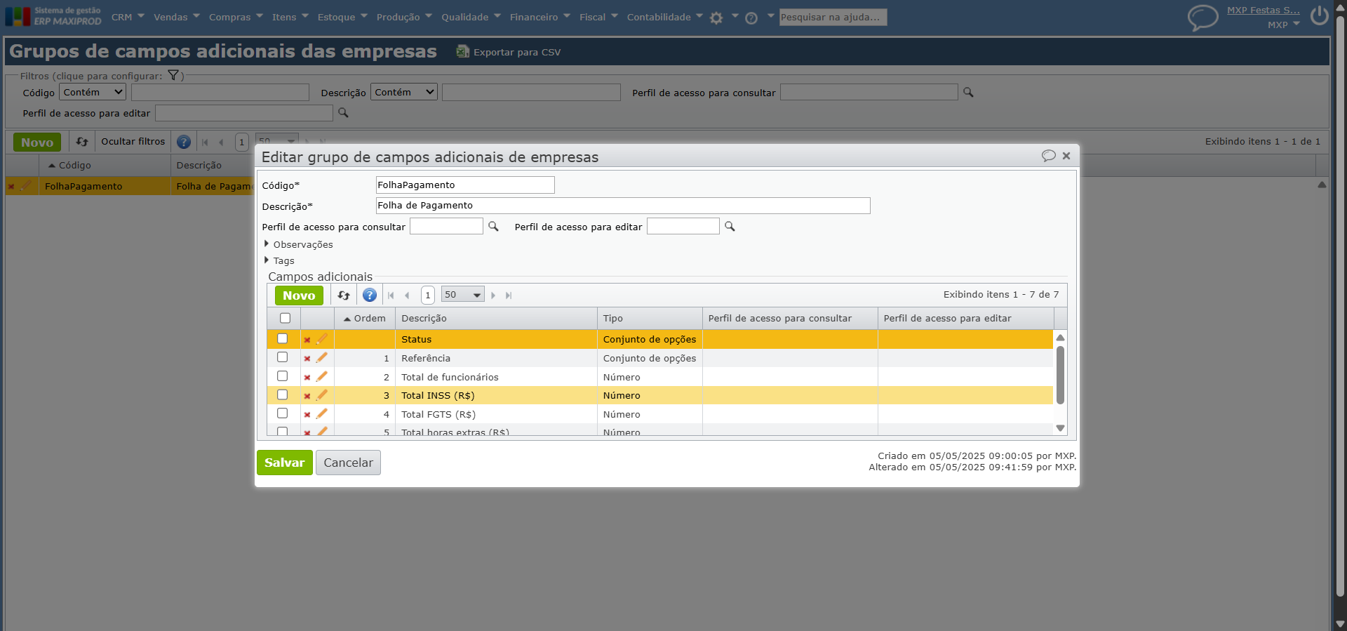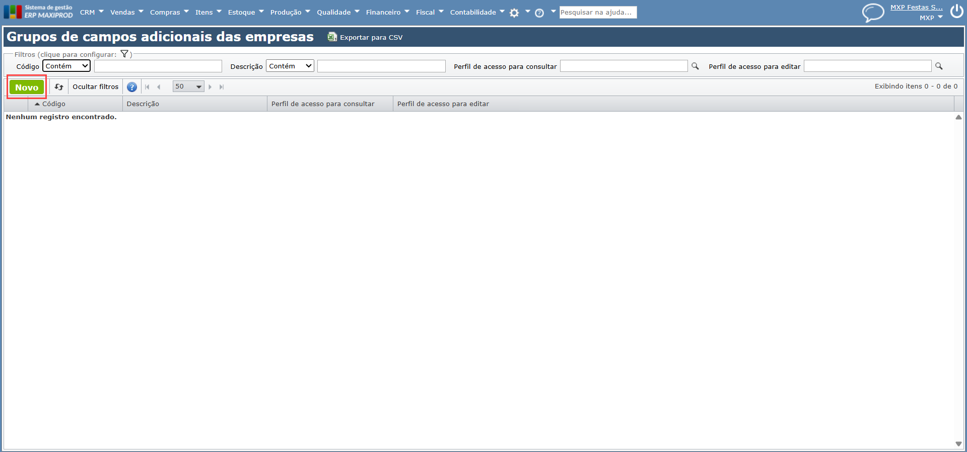 No ERP MAXIPROD, pode-se criar campos adicionais nos cadastros de empresa. Estes campos podem ser agrupados, melhorando a visualização e o preenchimento.