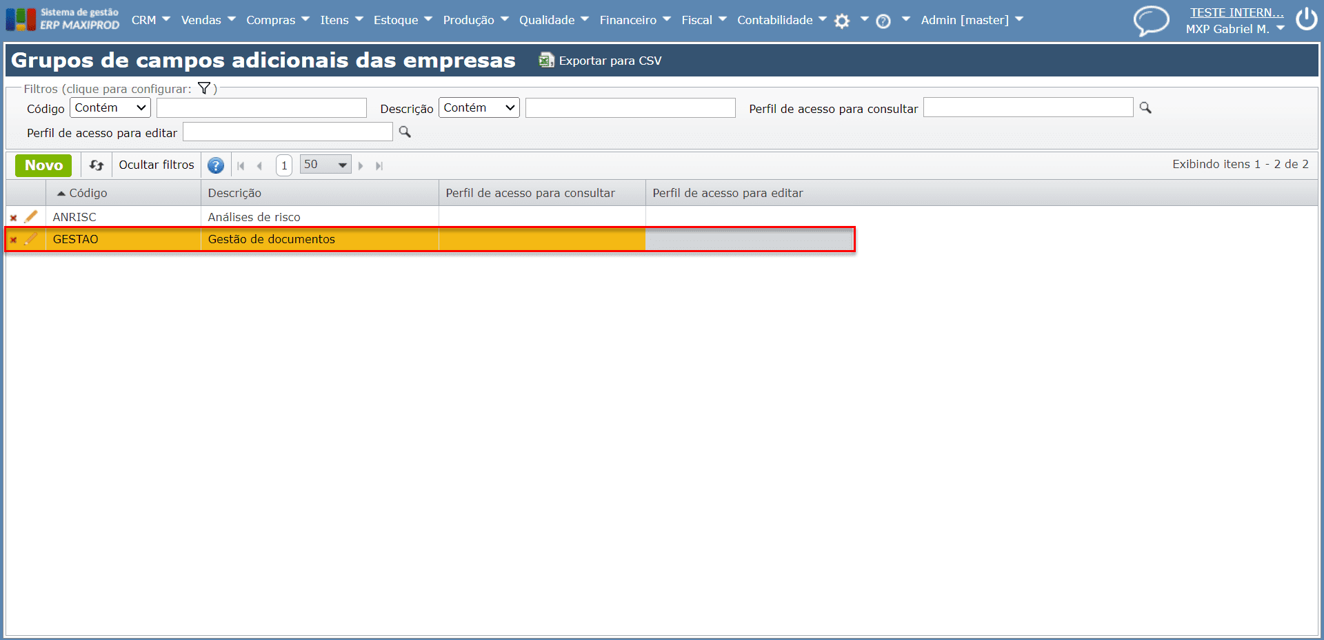 - Perfil de acesso para editar: restringe a edição do campo, no cadastro de empresa e é inicializado pelo do grupo, podendo ser alterado conforme desejado.