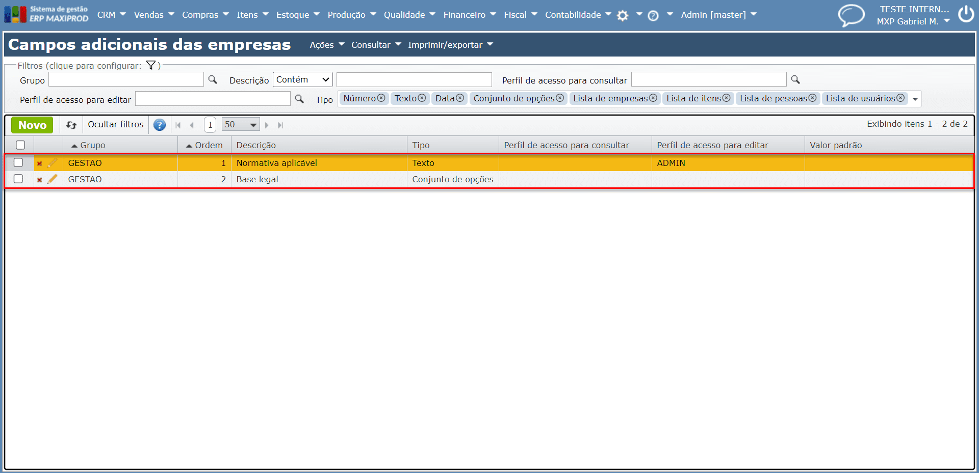 4) Informando o perfil de acesso para consultar “CRM”, no campo adicional “Normativa aplicável”, apenas usuários com o perfil “CRM” verão este campo.