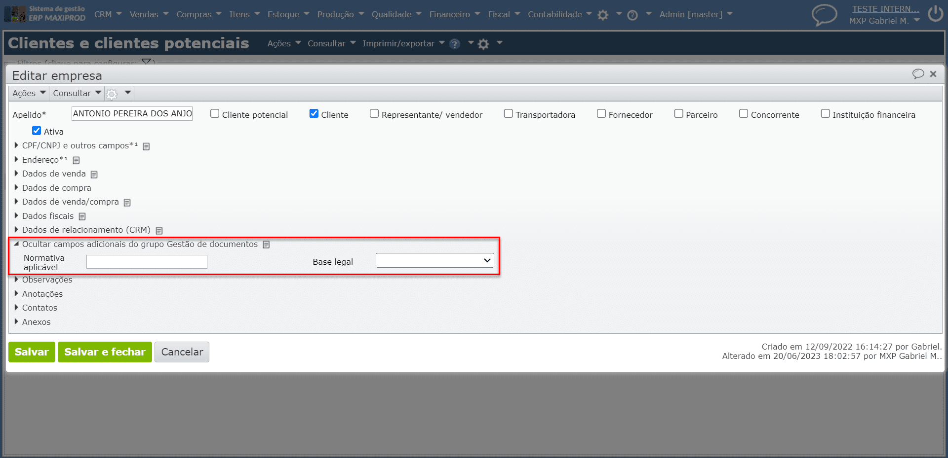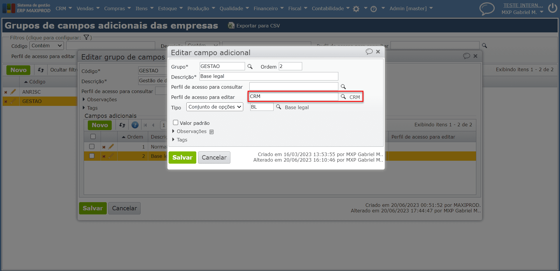 5) Se informado o perfil de acesso para editar “CRM”, no campo adicional “Base legal”, apenas usuários com o perfil “CRM” poderão editar este campo.
