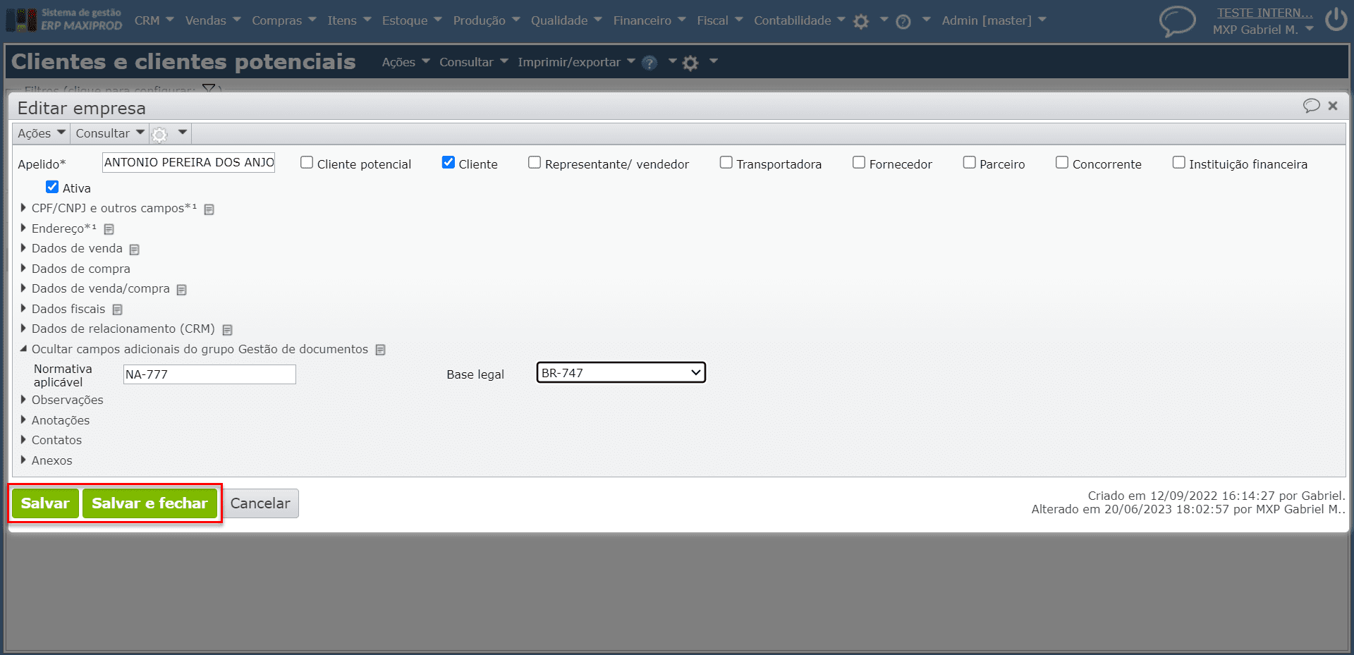 Após preencher os campos desejados, clique em “Salvar” ou “Salvar e fechar”: