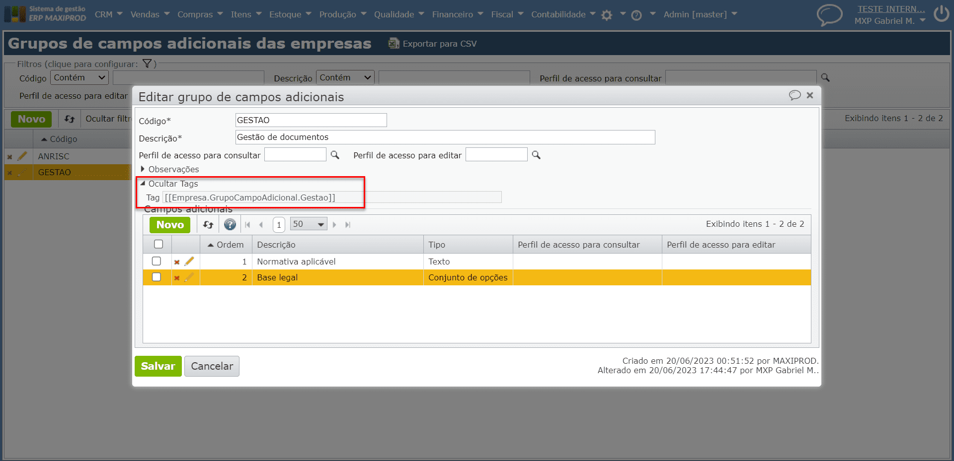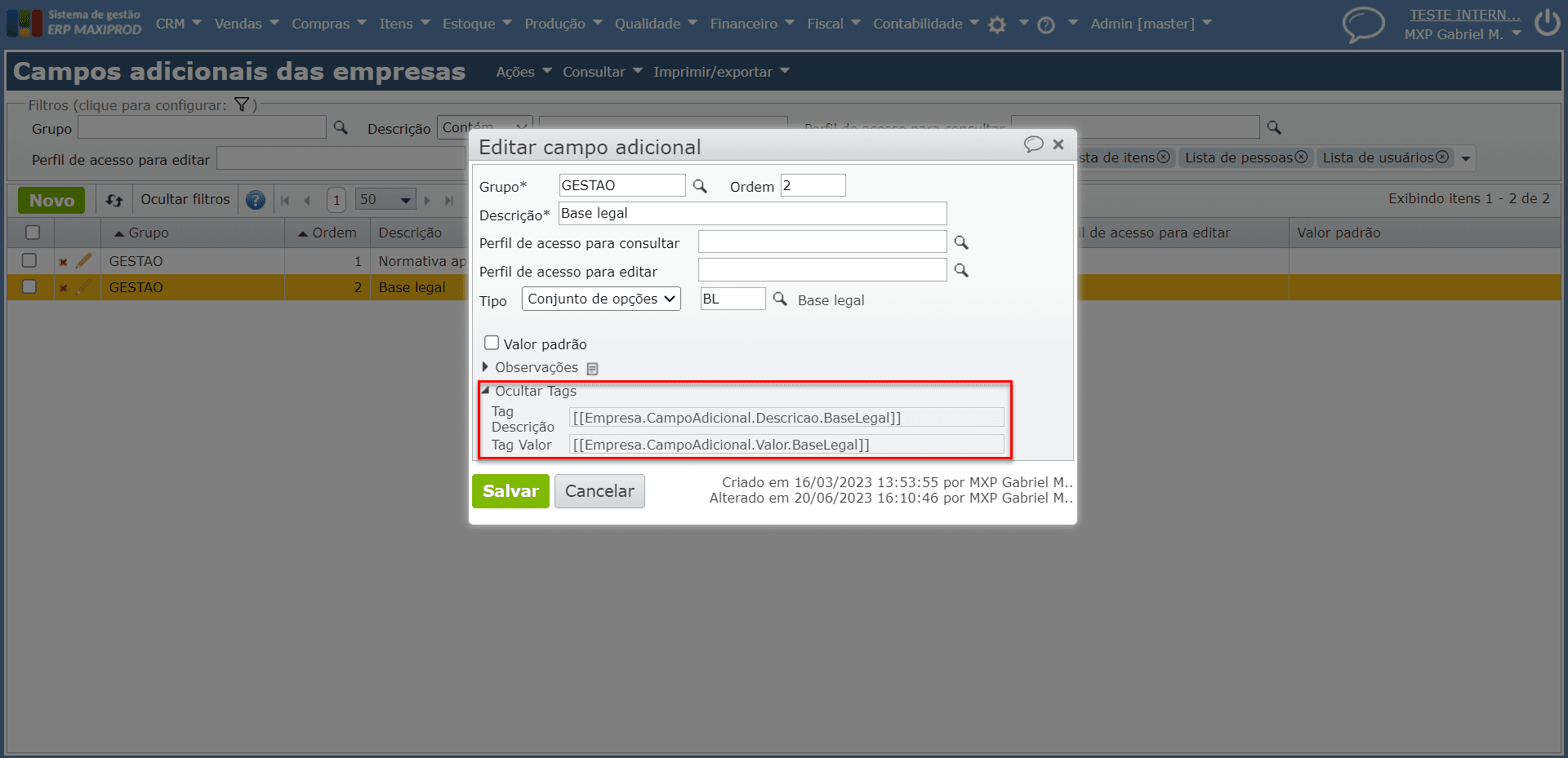 Uma vez criados os grupos e campos adicionais, para criar relatórios personalizados com estas informações, utilize as tags geradas automaticamente ao salvar o grupo/campo.