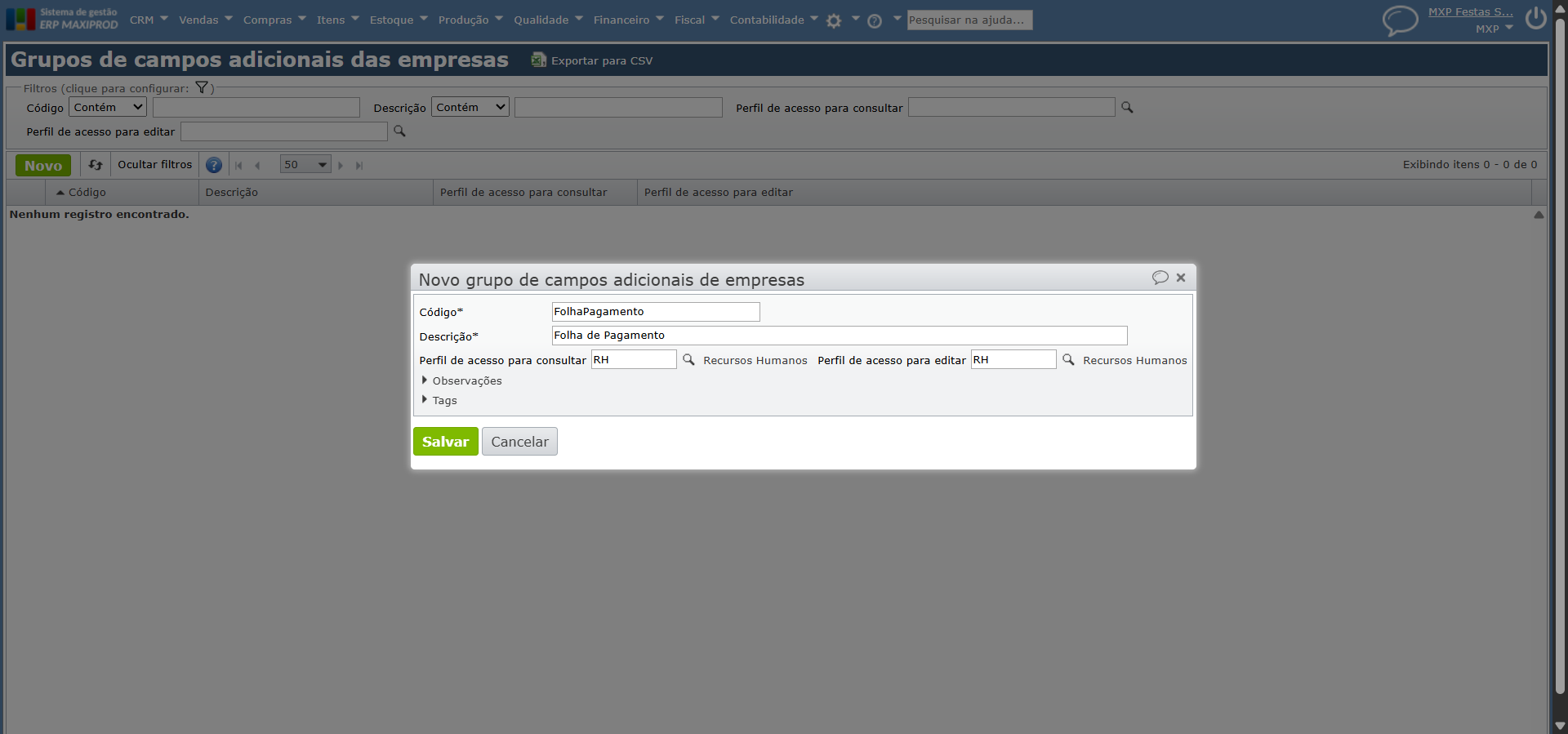 2) Informei o grupo “Folha de pagamento”, com o intuito de fazer um controle simples de valores da folha de pagamento da minha empresa. Portanto, preenchi os campos “Perfil de acesso para consultar” e “Perfil de acesso para editar” com o perfil “RH”. Ou seja, somente usuários com este perfil de acesso podem visualizar e editar o respectivo campo. Para saber mais sobre perfis de acesso, clique aqui.