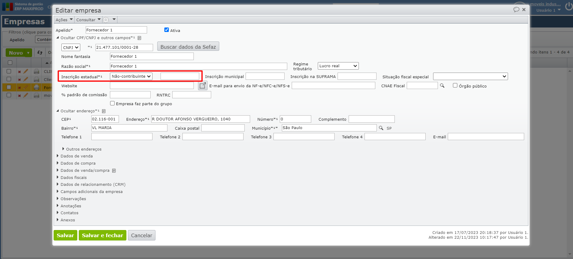 4) Se a empresa não for contribuinte (ou seja, se não possuir registro de inscrição estadual na UF pesquisada), selecione a opção “Não contribuinte“, no campo “Inscrição estadual“, e insira as informações do cadastro da empresa manualmente.