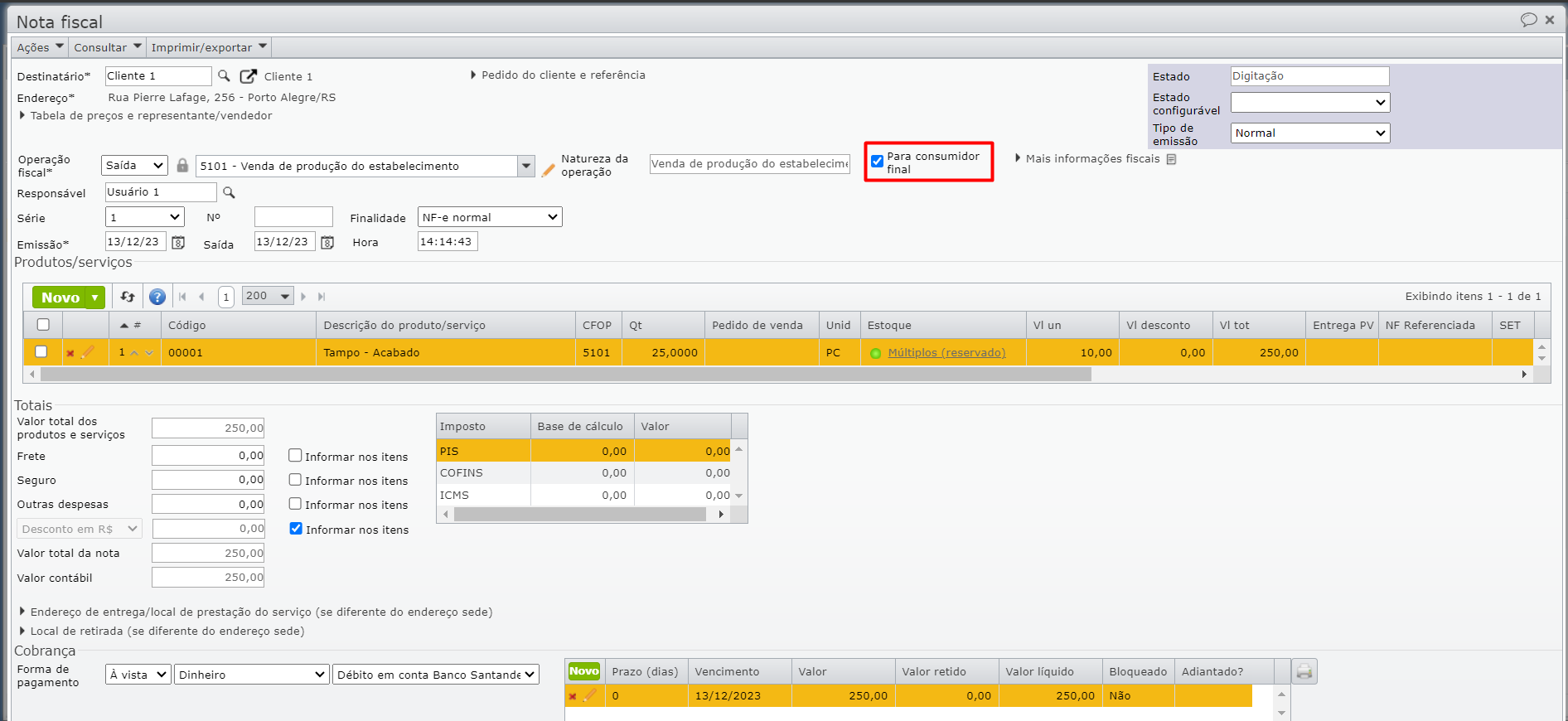 - Ao utilizar a opção “Não contribuinte” em “Inscrição estadual“, é obrigatório que a opção “Para consumidor final” seja marcada na emissão de NFs. Para mais informações sobre esta regra, clique aqui.