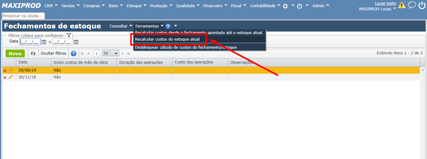 7) Na tela de fechamentos de estoque, clique no menu “Ferramentas” > “Recalcular custo do estoque atual”.