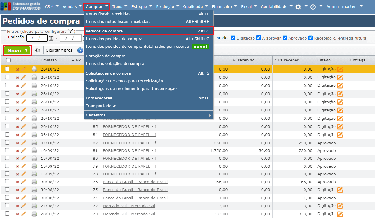 1) Na tela de pedidos de compra (acessada através de “Compras > Pedidos de compra”), clique em “Novo” para criar um novo pedido.