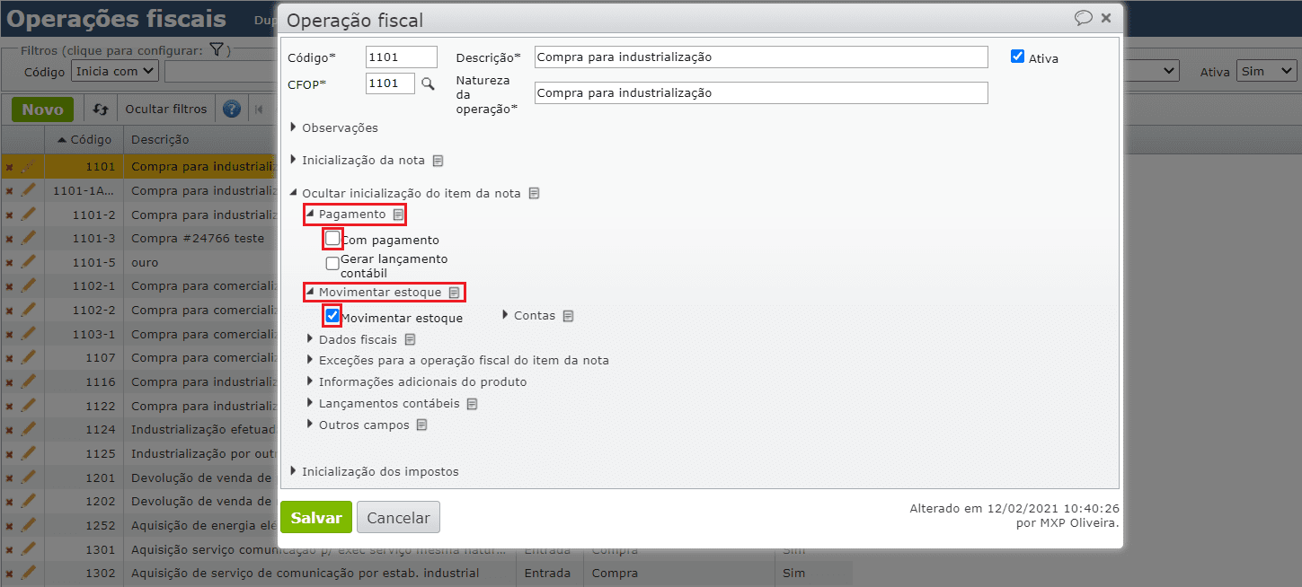 4) A opção “Movimentar estoque” deve estar desmarcada, pois nessa primeira nota não haverá movimentação. Clique para salvar as edições feitas nessa Operação Fiscal.