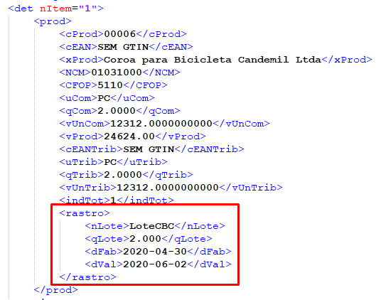 Obs.: a ausência deste grupo de tags no XML não impede o usuário de informar manualmente o lote no item da nota.