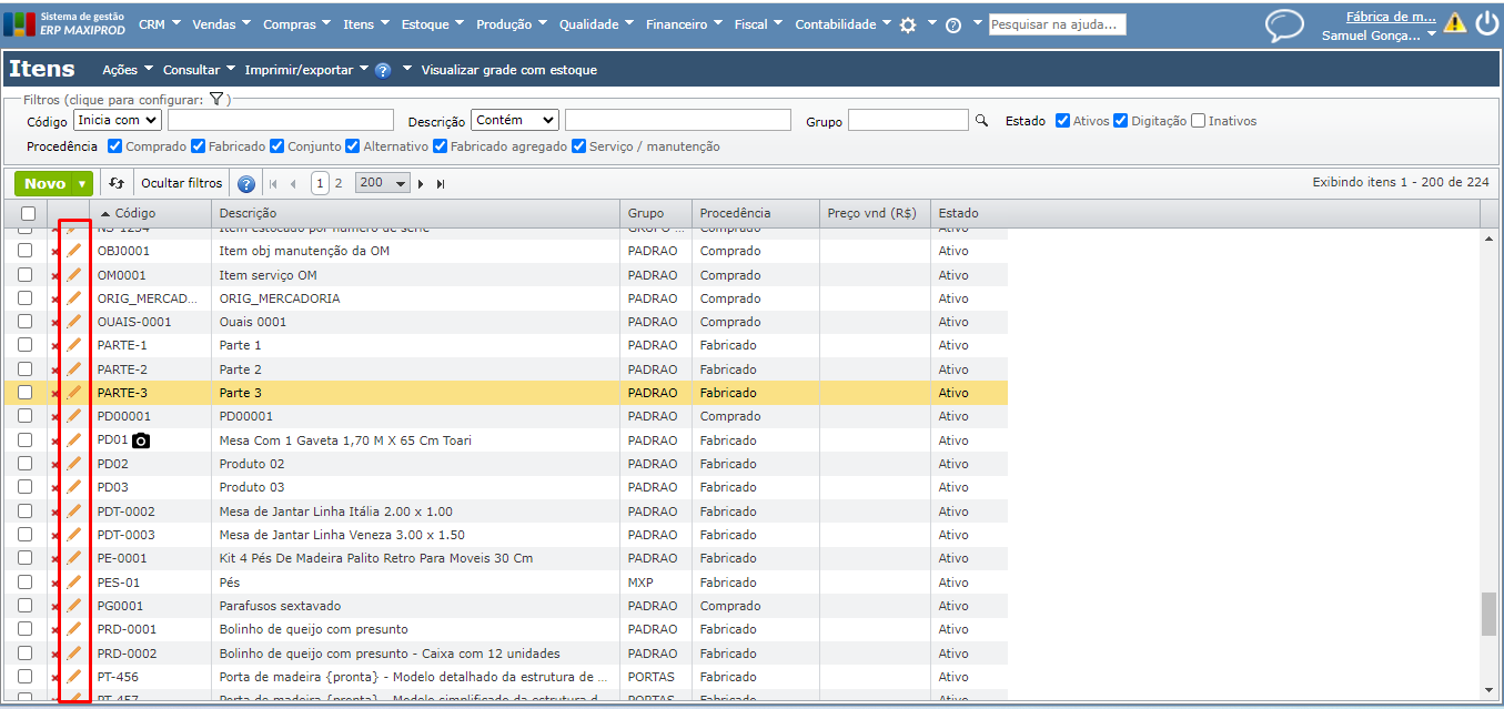 b) Localize o cadastro do item e clique no ícone do lápis para abrir a janela de edição.