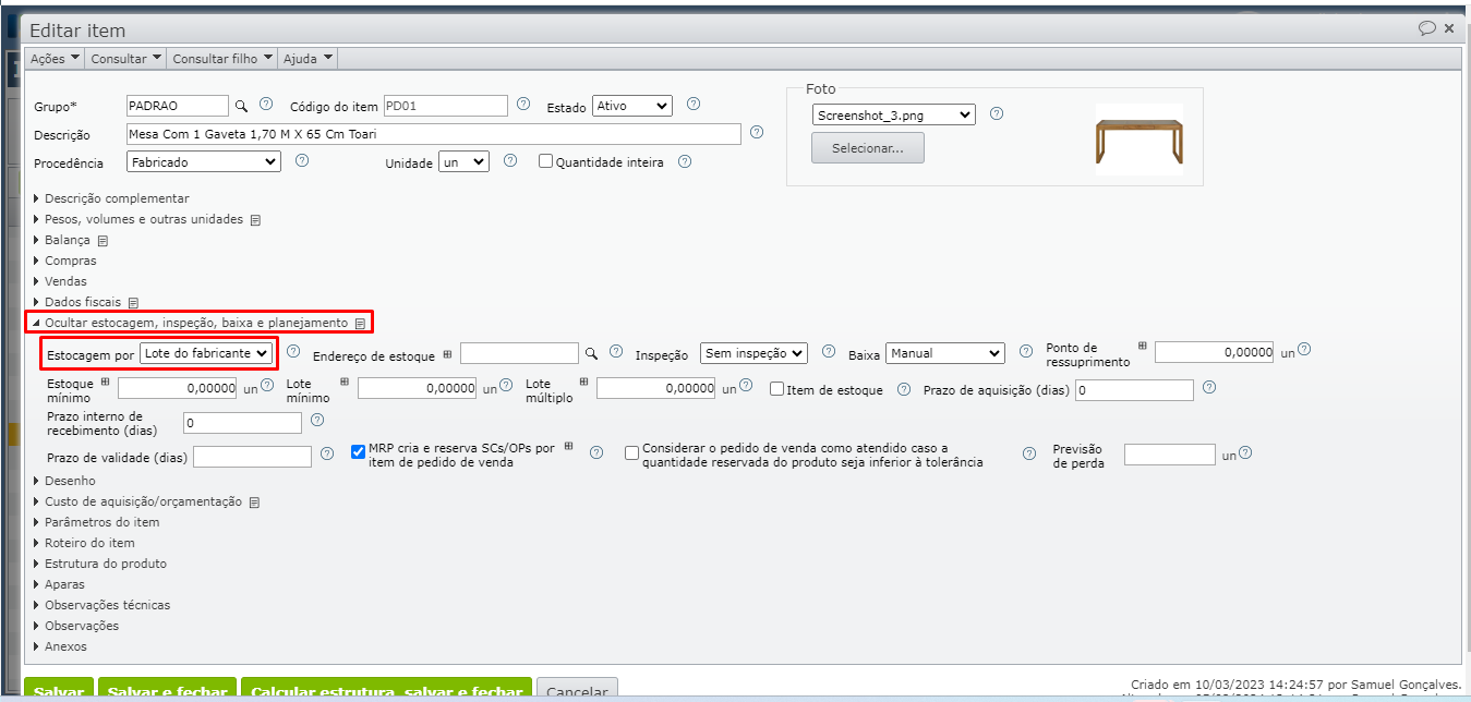 c) Expanda a seção “Estocagem, inspeção, baixa e planejamento” , e verifique a configuração do campo “Estocagem por”, que deve ser por “Lote do fabricante” ou “Número de série”.