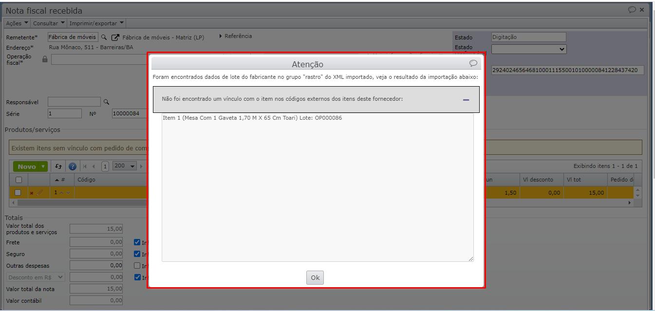 "Foram encontrados dados de lote do fabricante no grupo "rastro" do XML importado, veja o resultado da importação abaixo: Não foi encontrado um vínculo com o item nos códigos externos dos itens deste fornecedor:"