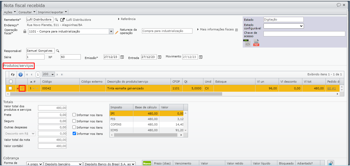 1) Acesse a janela de edição do item da nota clicando no ícone do lápis na grade de “Produtos e serviços” da NF em estado de “Digitação”.