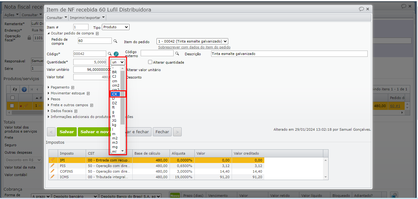 Após cadastrar a unidade de compra do item, esta unidade de compra será inicializada nos documentos de compra, como a NF recebida. No entanto, é possível alterar a unidade de compra diretamente na edição do item da nota.