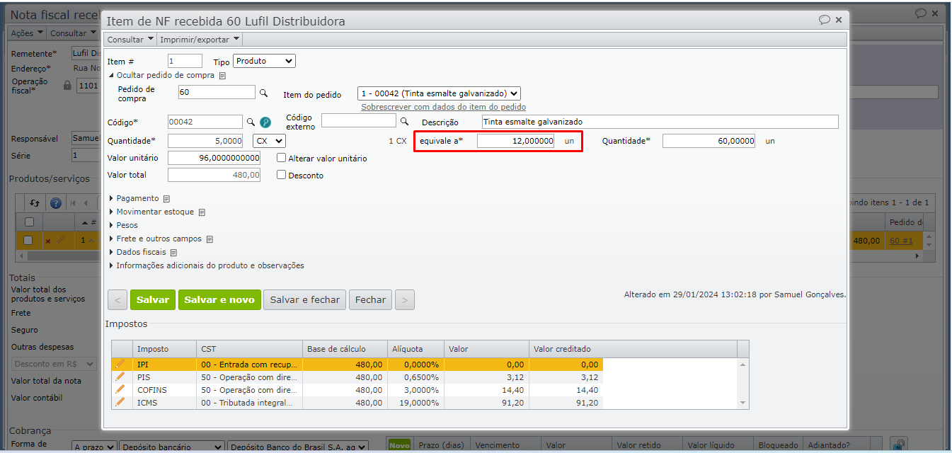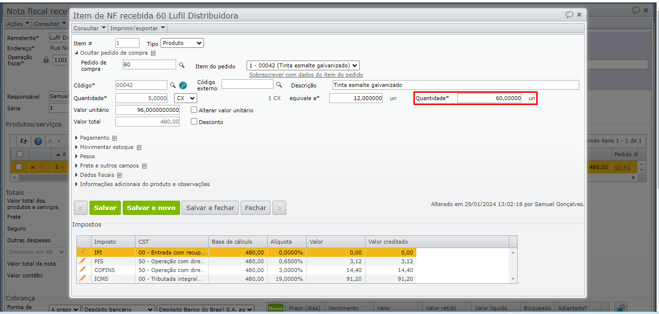 4) O campo “Quantidade”, mais à direita da janela, indica a quantidade total da unidade de estoque, resultante da quantidade da unidade de compra multiplicada pela quantidade do fator de conversão.