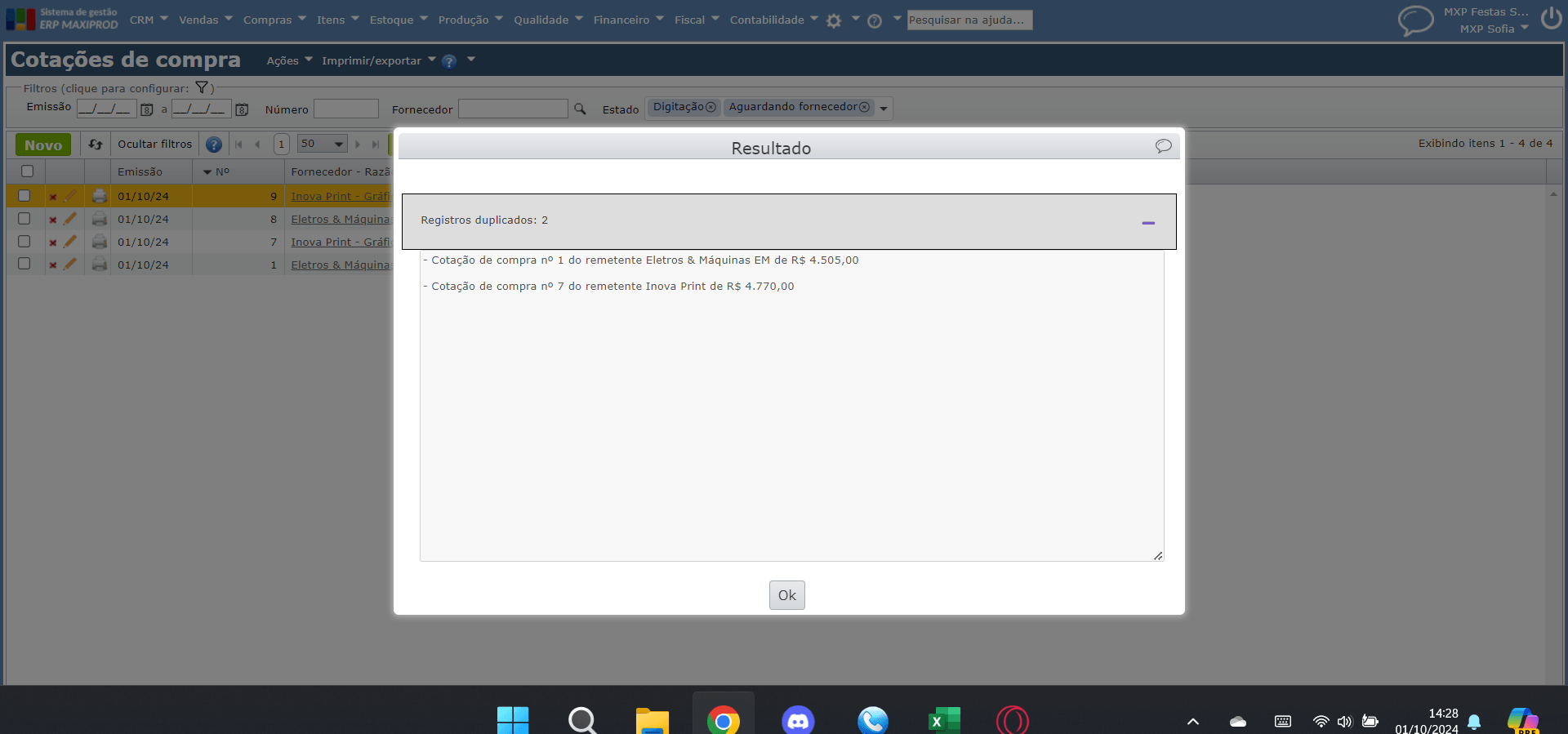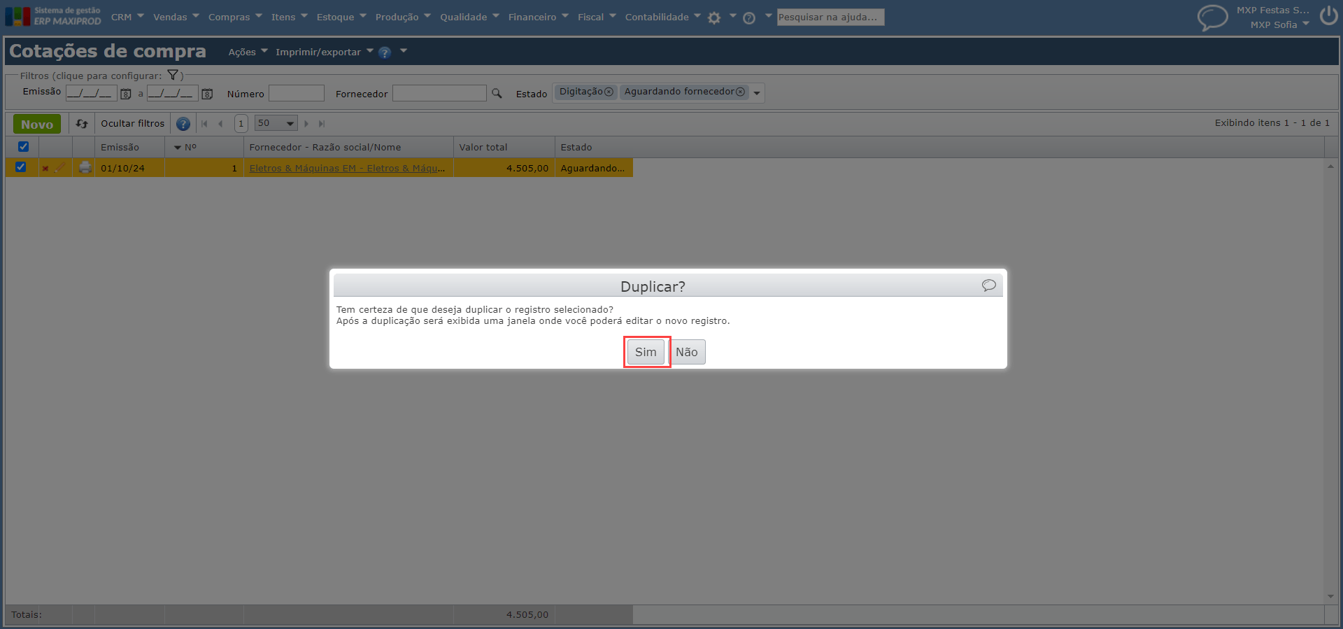 a) Se foi selecionado apenas um registro, o ERP MAXIPROD pedirá a confirmação desta ação, pela mensagem abaixo. Clique em “Sim”, e será aberta a tela de edição da nova cotação.