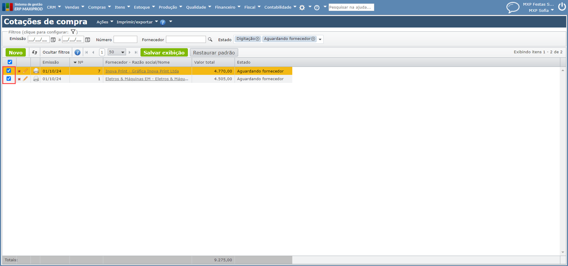 2) Marque a caixa de seleção das cotações a duplicar. Se preciso, veja como criar cotações clicando aqui;