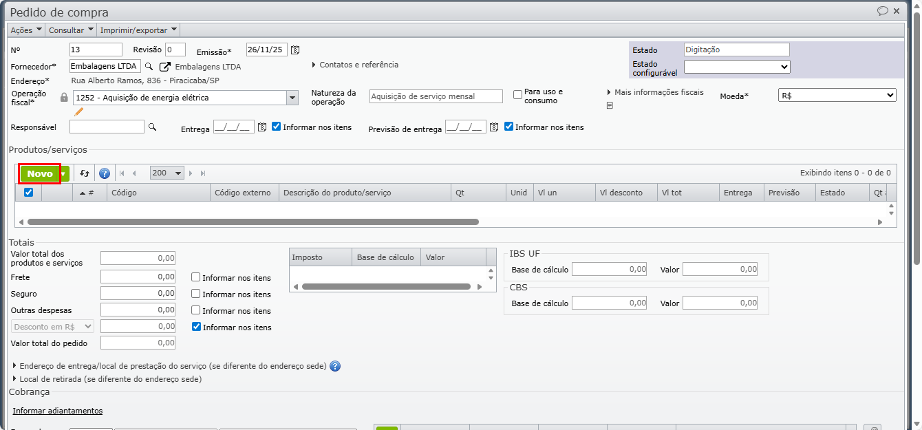 1) Acesse a tela “Compras > Pedidos de compra” e clique no botão verde “Novo” para criar um novo pedido de compra. Preencha as informações necessárias. Para saber mais sobre pedidos de compra, clique aqui.