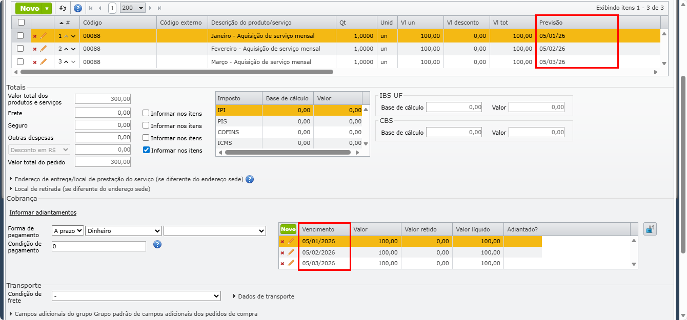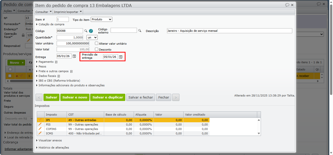3) Preencha as informações do item. No campo “Previsão de entrega”, informe a data de vencimento da parcela gerada a partir daquele item.