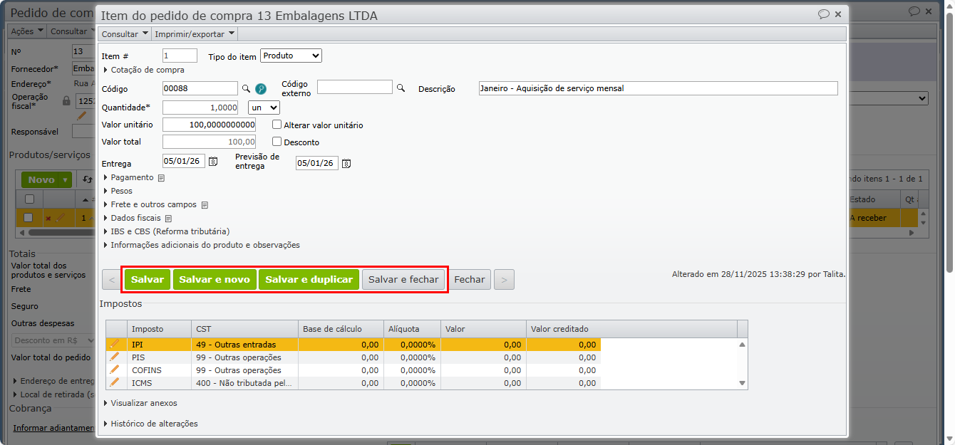 4) Clique em um dos botões de salvar para registrar as informações do item adicionado.
