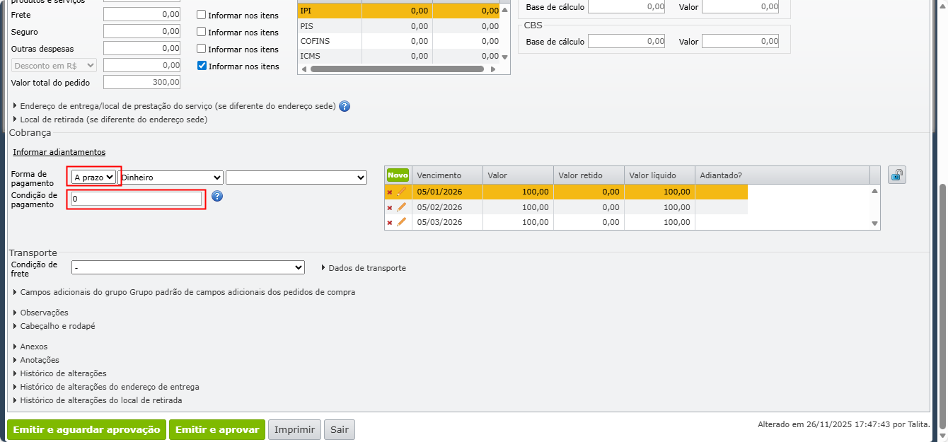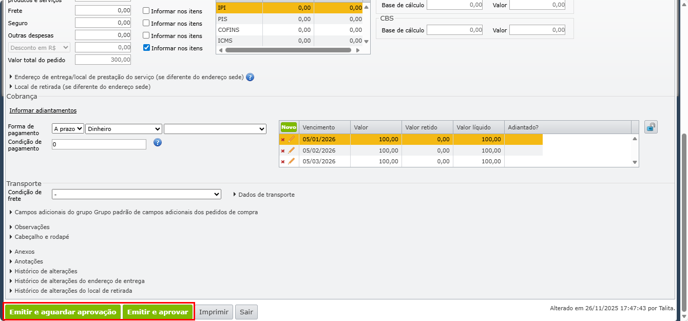 7) Para gerar as previsões, emita o pedido, clicando no botão verde “Emitir e aguardar aprovação” ou “Emitir e aprovar”.