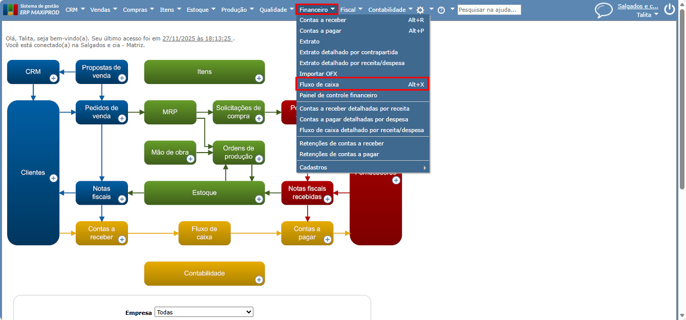 a) Acesse a opção “Financeiro > Fluxo de caixa”.