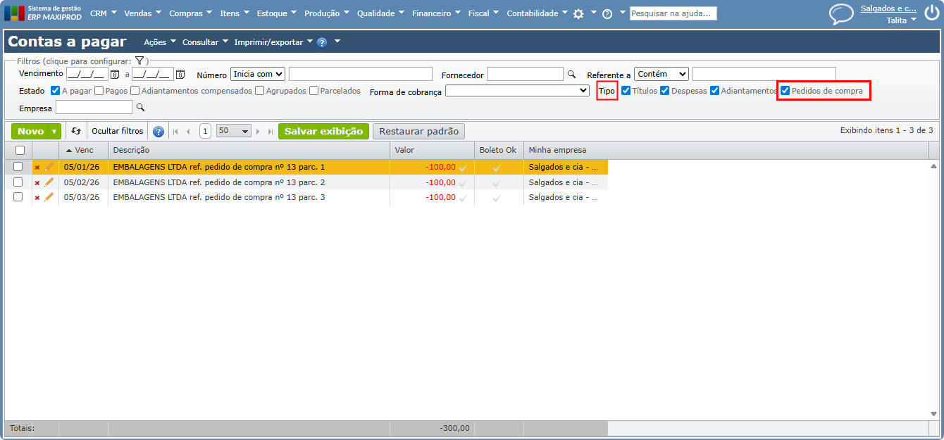b) Na parte superior no filtro “Tipo” ative a opção “Pedidos de compra”, marcando a caixa de seleção. Desta forma, os títulos previstos no pedido de compra constarão na tela de contas a pagar.
