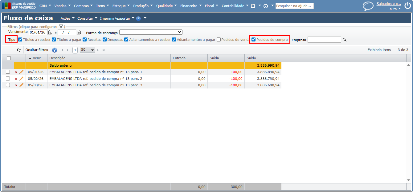b) Na parte superior no filtro “Tipo” ative a opção “Pedidos de compra”, marcando a caixa de seleção. Desta forma, os títulos previstos no pedido de compra constarão na tela de fluxo de caixa.