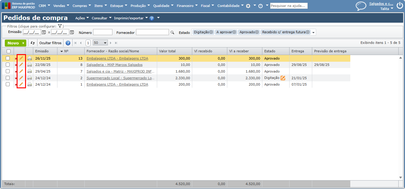 1) Acesse o pedido de compra que contém as previsões, clicando no ícone de lápis para editar.