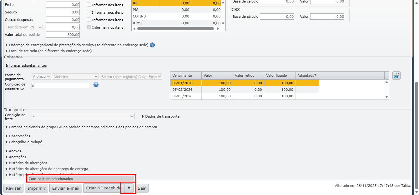 3) Ao final da página, clique no ícone de seta apontando para baixo, localizado na lateral direita do botão “Criar NF recebida”, e selecione a opção “Com os itens selecionados”.