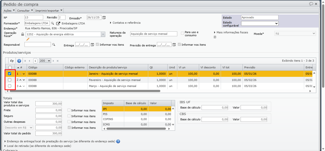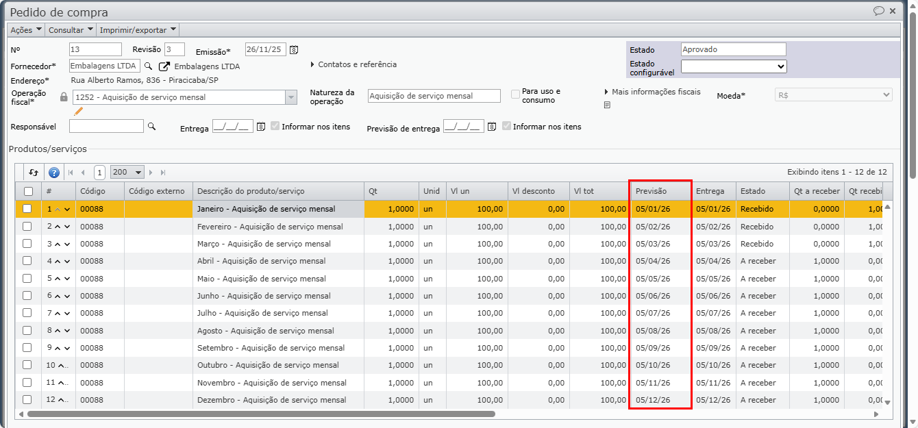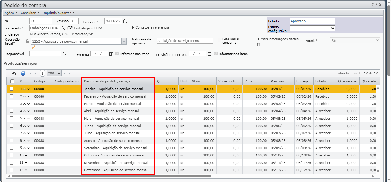 1) Foi criado um pedido de compra, com um item por mês do ano.
