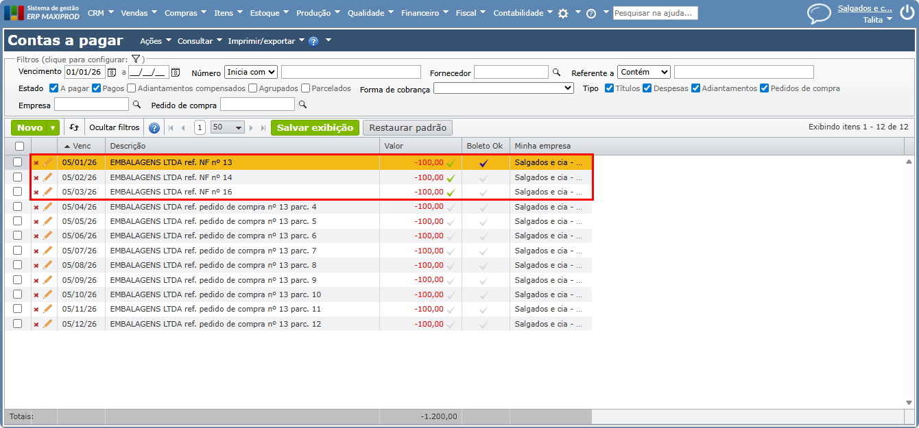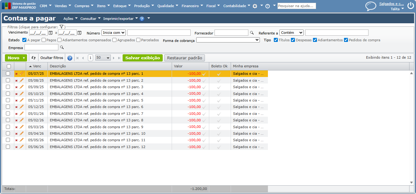 3) Após emitir o pedido de compra, pode-se consultar as previsões geradas, na tela de contas a pagar.
