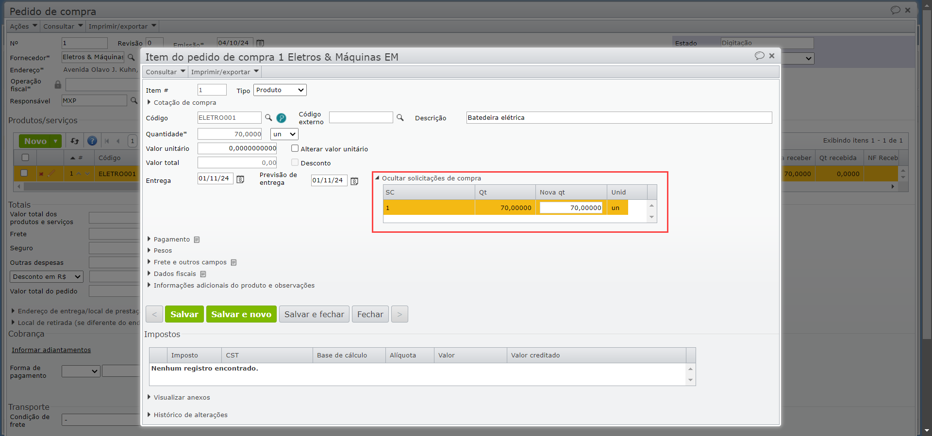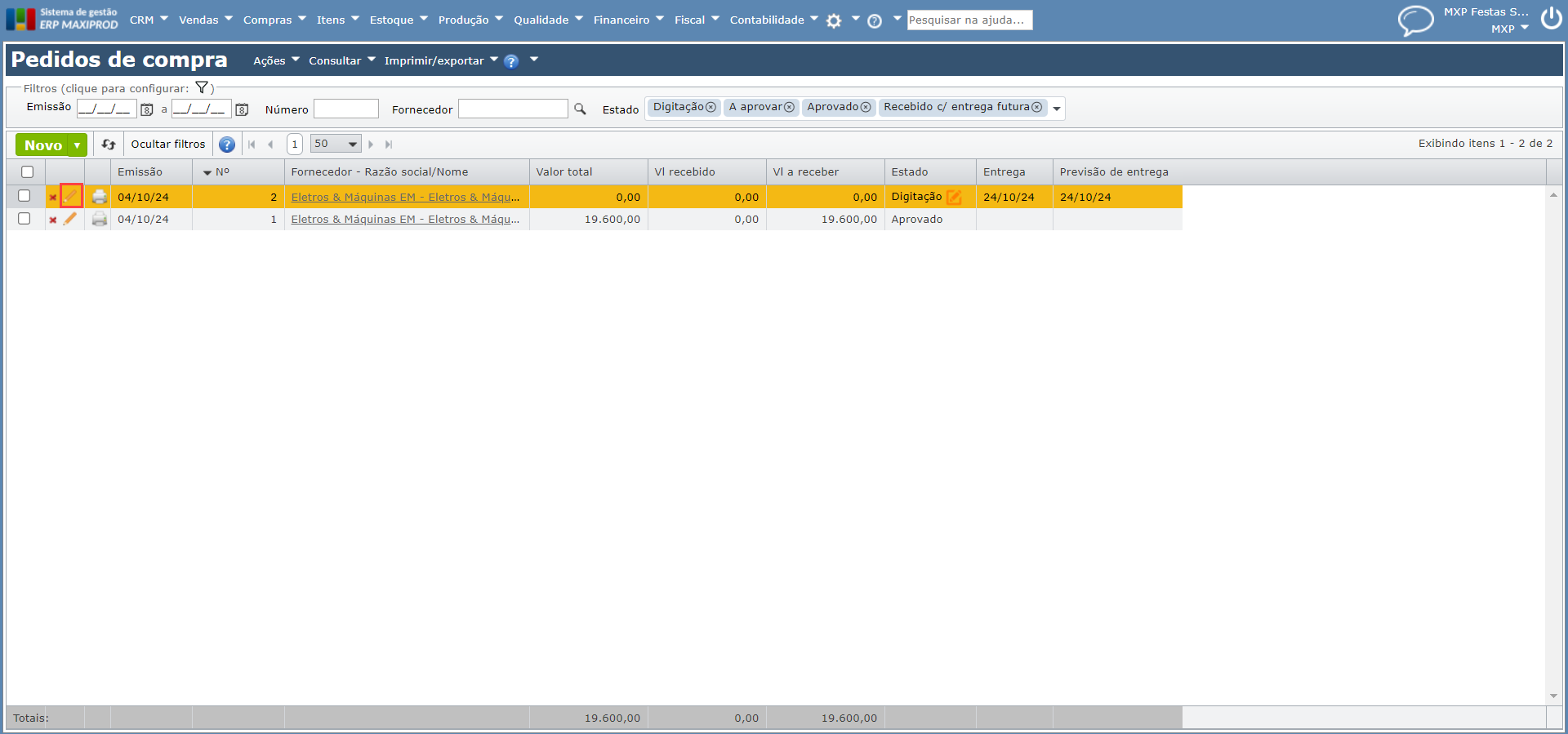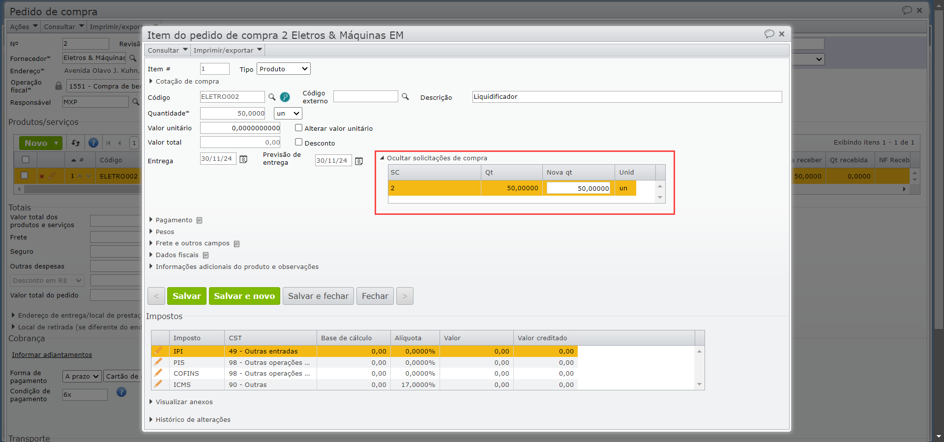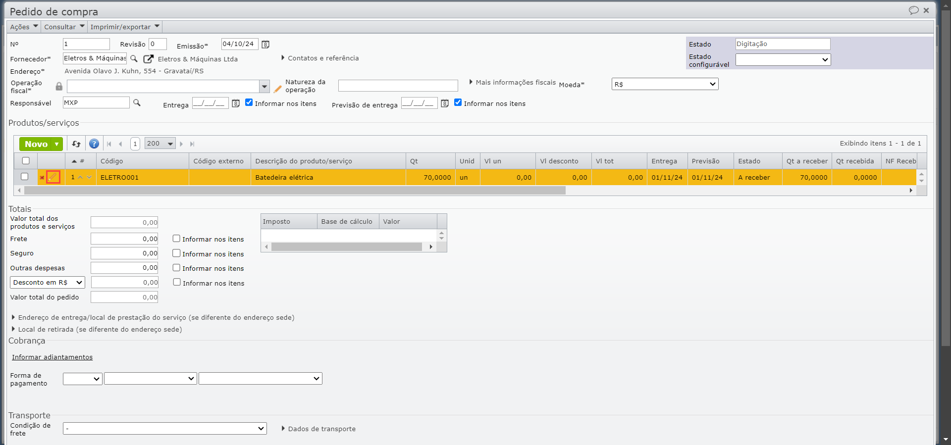 4) Será aberta a tela de edição do novo pedido de compra. Edite o item, clicando no ícone do lápis.
