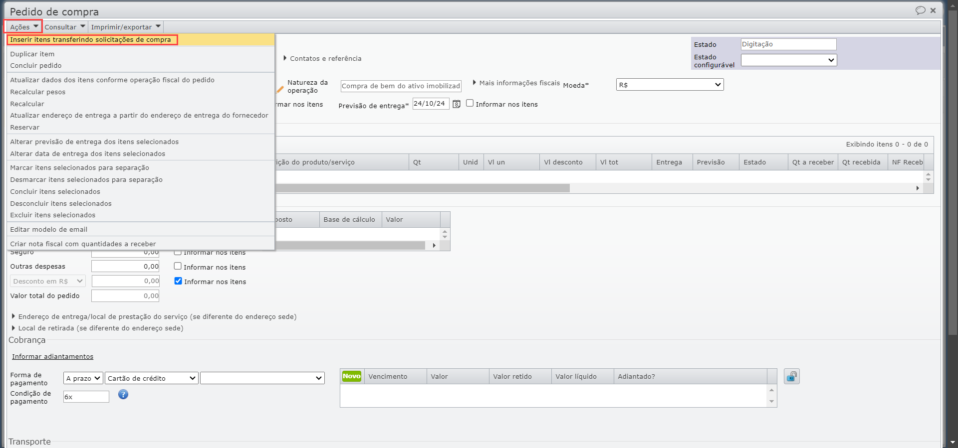 3) Clique no menu “Ações > Inserir itens transferindo solicitações de compra”.
