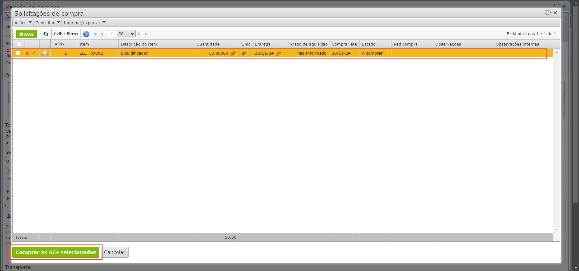 4) Será mostrada a tela de solicitações de compra. Selecione a solicitação a atender e clique em “Comprar as SCs selecionadas”.