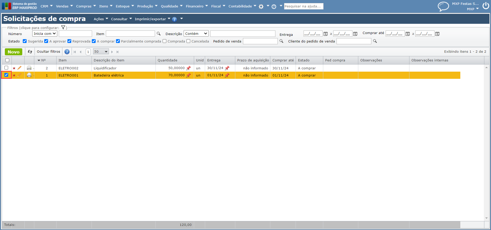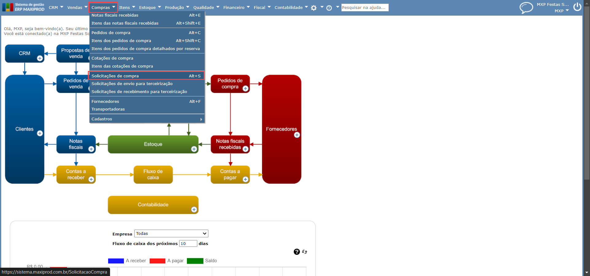 1) Acesse a tela “Compras > Solicitações de compra”.