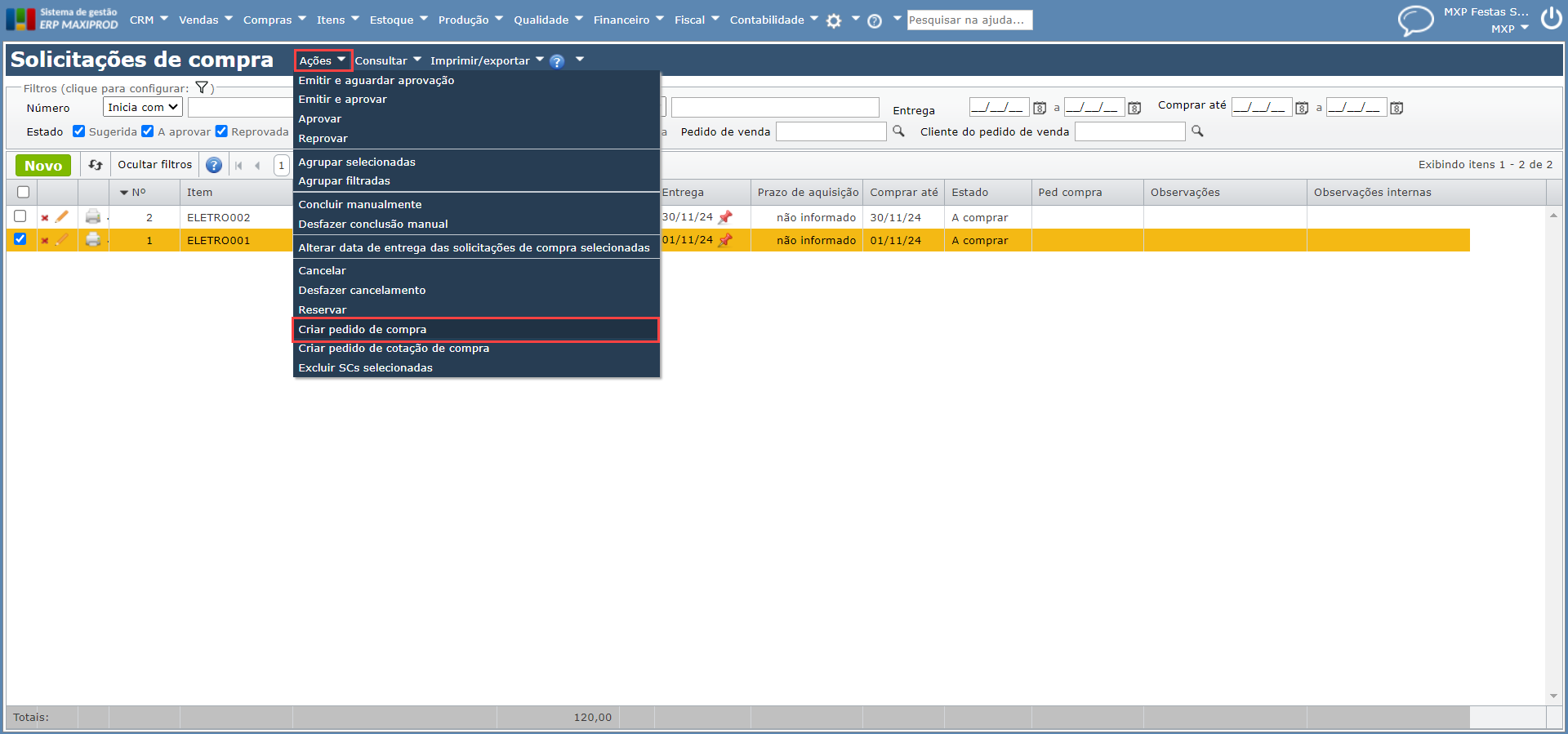 3) Com as solicitações de compra selecionadas, acesse o menu “Ações > Criar pedido de compra”.