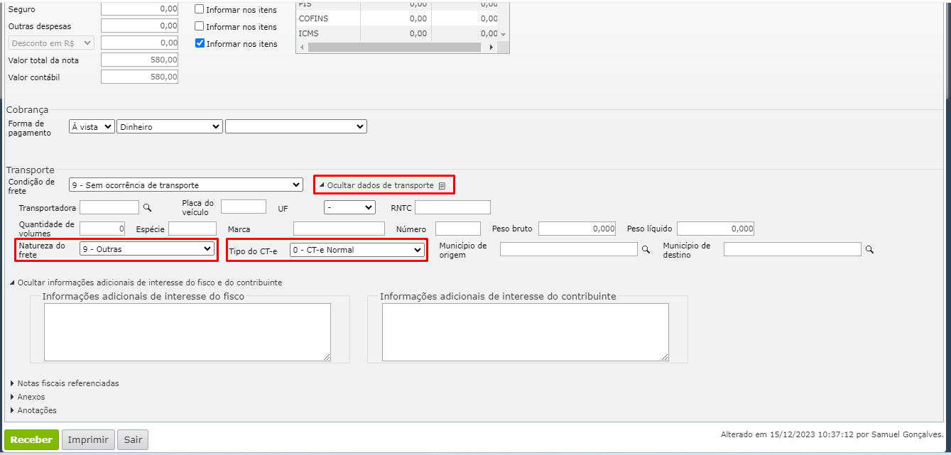1) Esta mensagem é exibida, ao clicar em “Receber”, na edição de um CT-e (Conhecimento de Transporte Eletrônico), mais conhecido como “Nota de frete”, desde que, os referidos campos não estejam preenchidos na seção “Transporte”, da edição do documento, sendo que a configuração “Gerar SPED Contribuições”, está marcada. Para saber mais sobre CT-e, clique aqui.