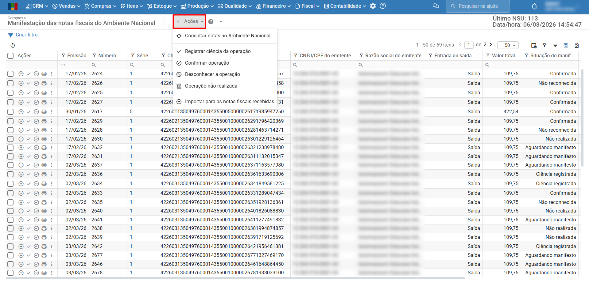 1) Acesse a tela “Compras > Manifestação das notas fiscais do Ambiente Nacional”.