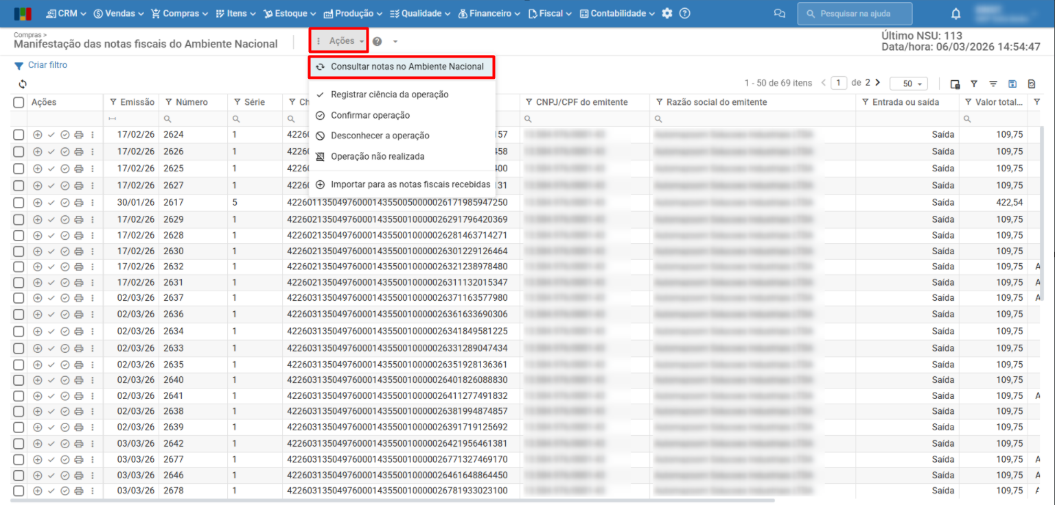 2) Utilize o menu “Ações > Consultar notas no Ambiente Nacional”.