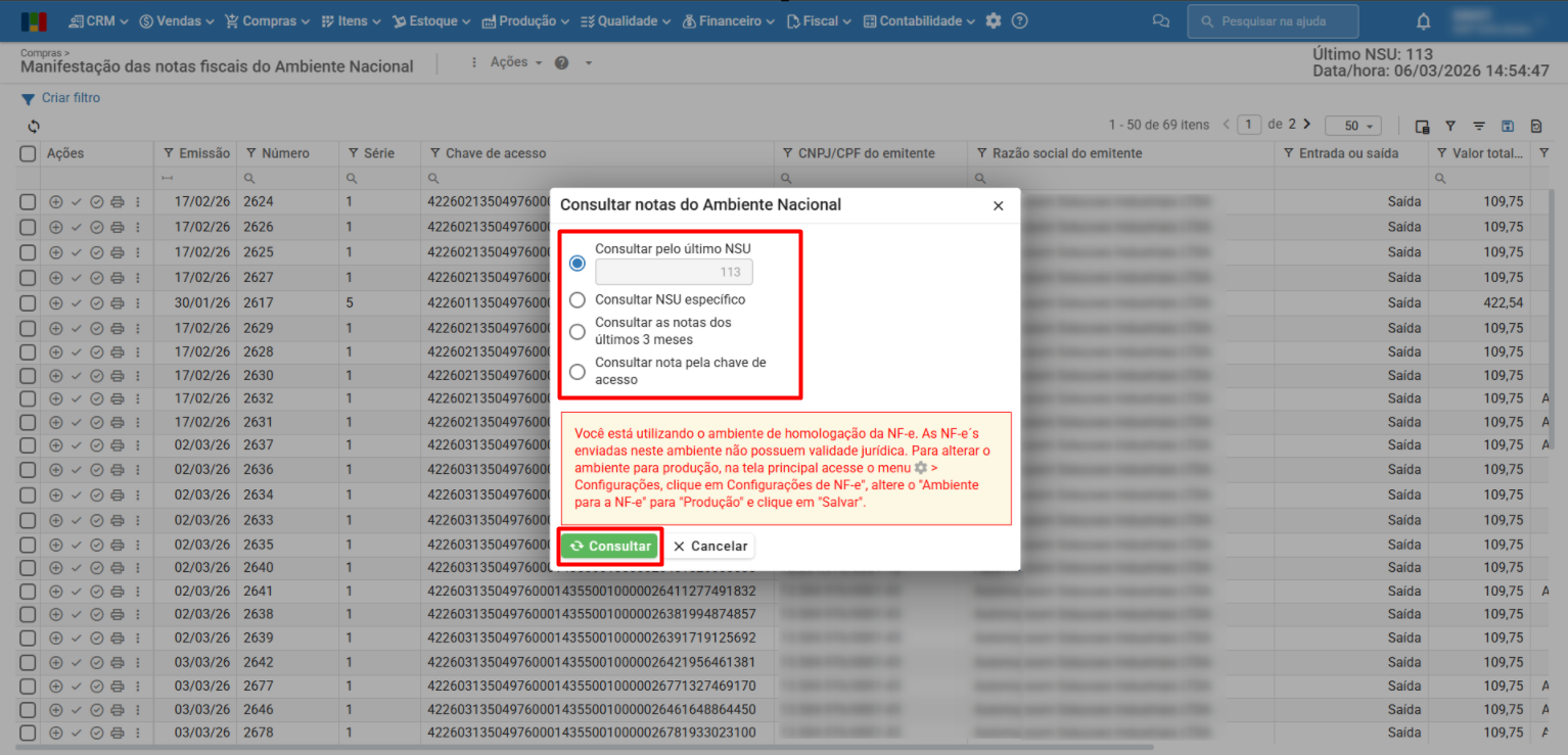 - Consultar notas no Ambiente Nacional: realiza a consulta e importação das notas no Ambiente Nacional para o ERP MAXIPROD, conforme a opção escolhida. As opções de consulta são: