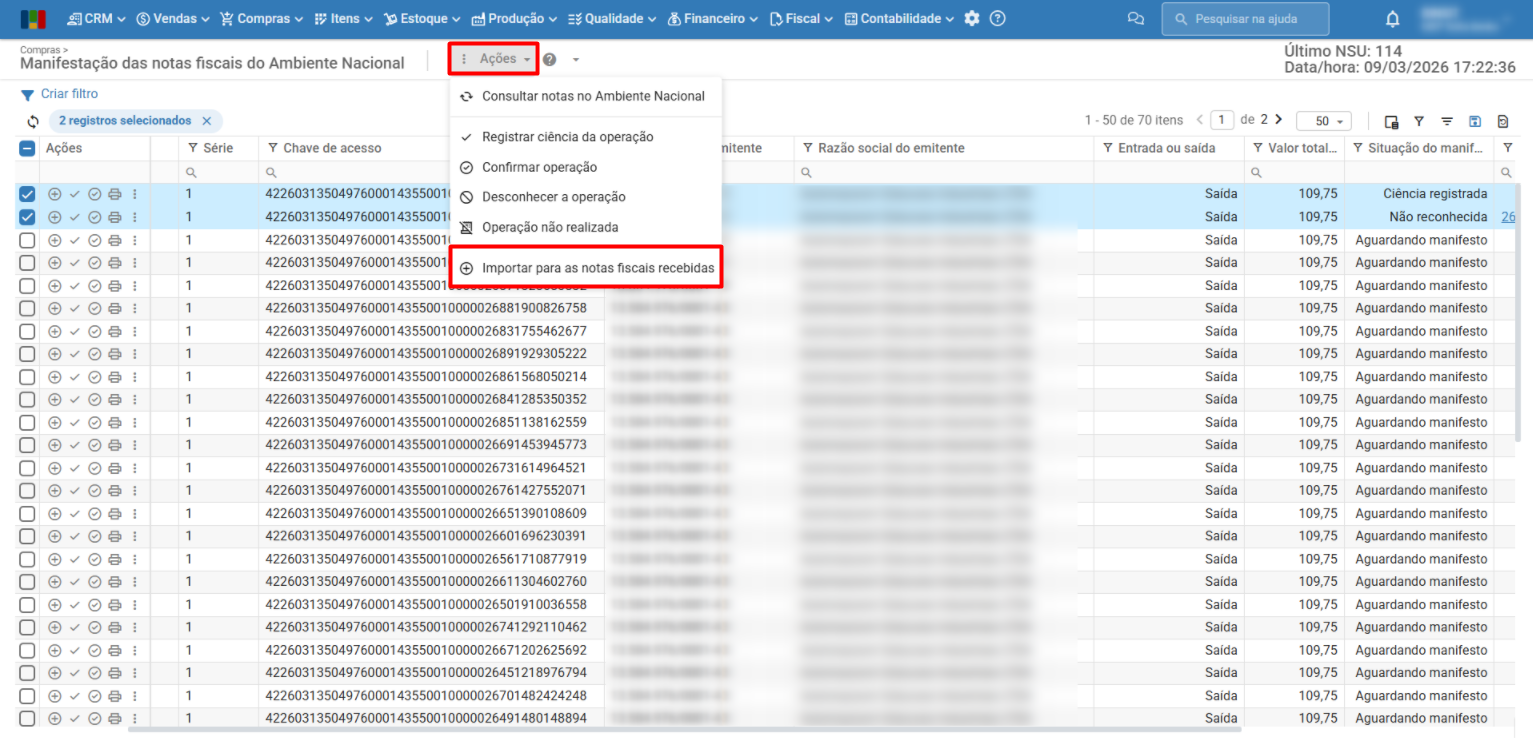 7) Por fim, selecione as notas que deseja importar, e utilize o menu “Ações > Importar para as notas fiscais recebidas”.