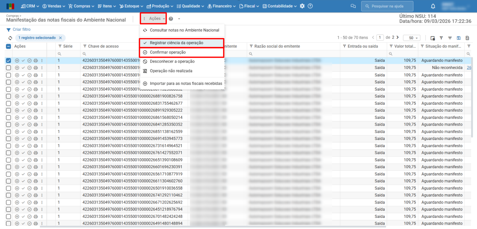 5) Após fechar a tela de resultado, as notas criadas com sucesso estarão com a situação “Aguardando manifesto”. Selecione as que desejar, clicando na “caixa de seleção”, e depois utilize o menu “Ações > Registrar ciência da operação” ou “Confirmar operação”.